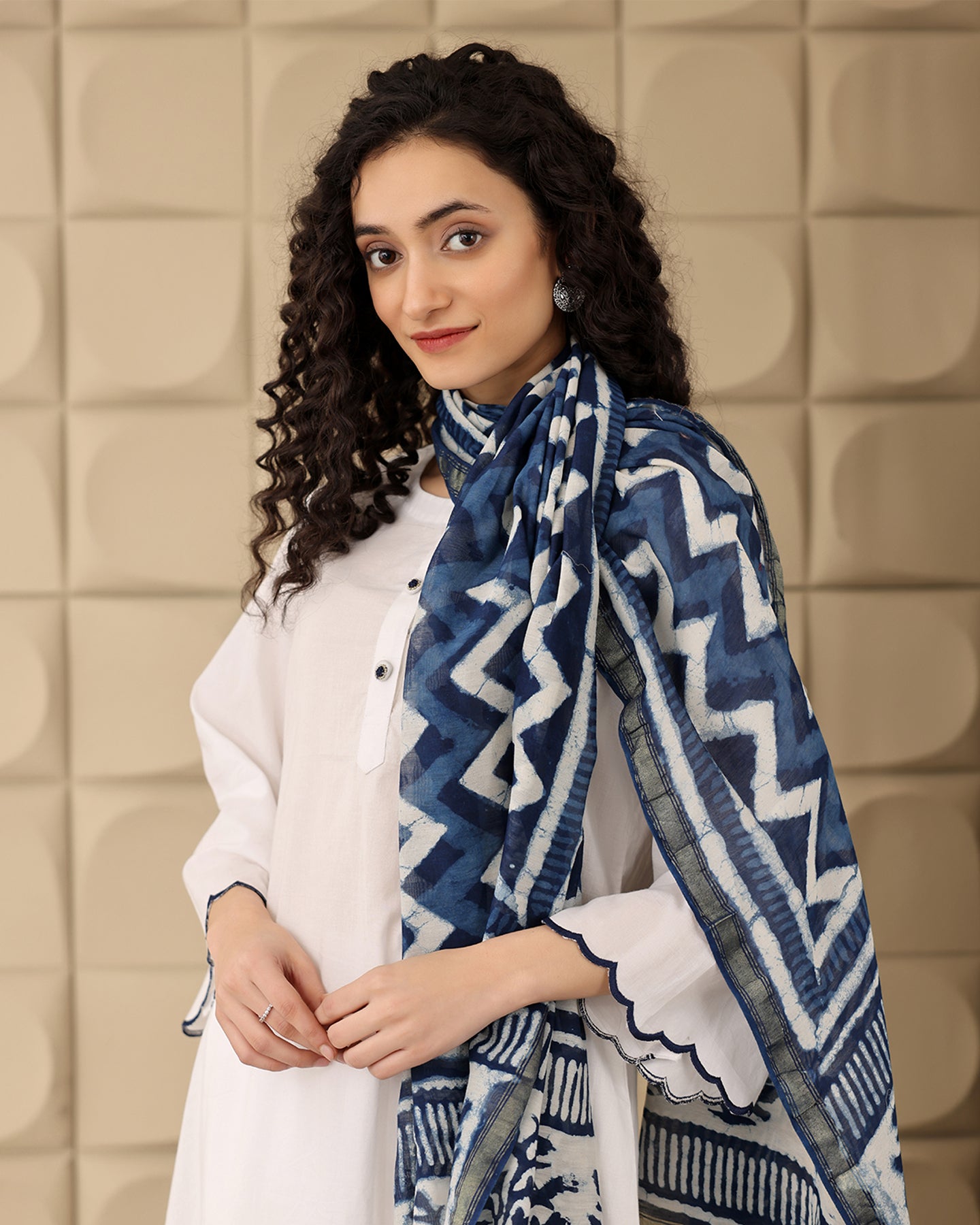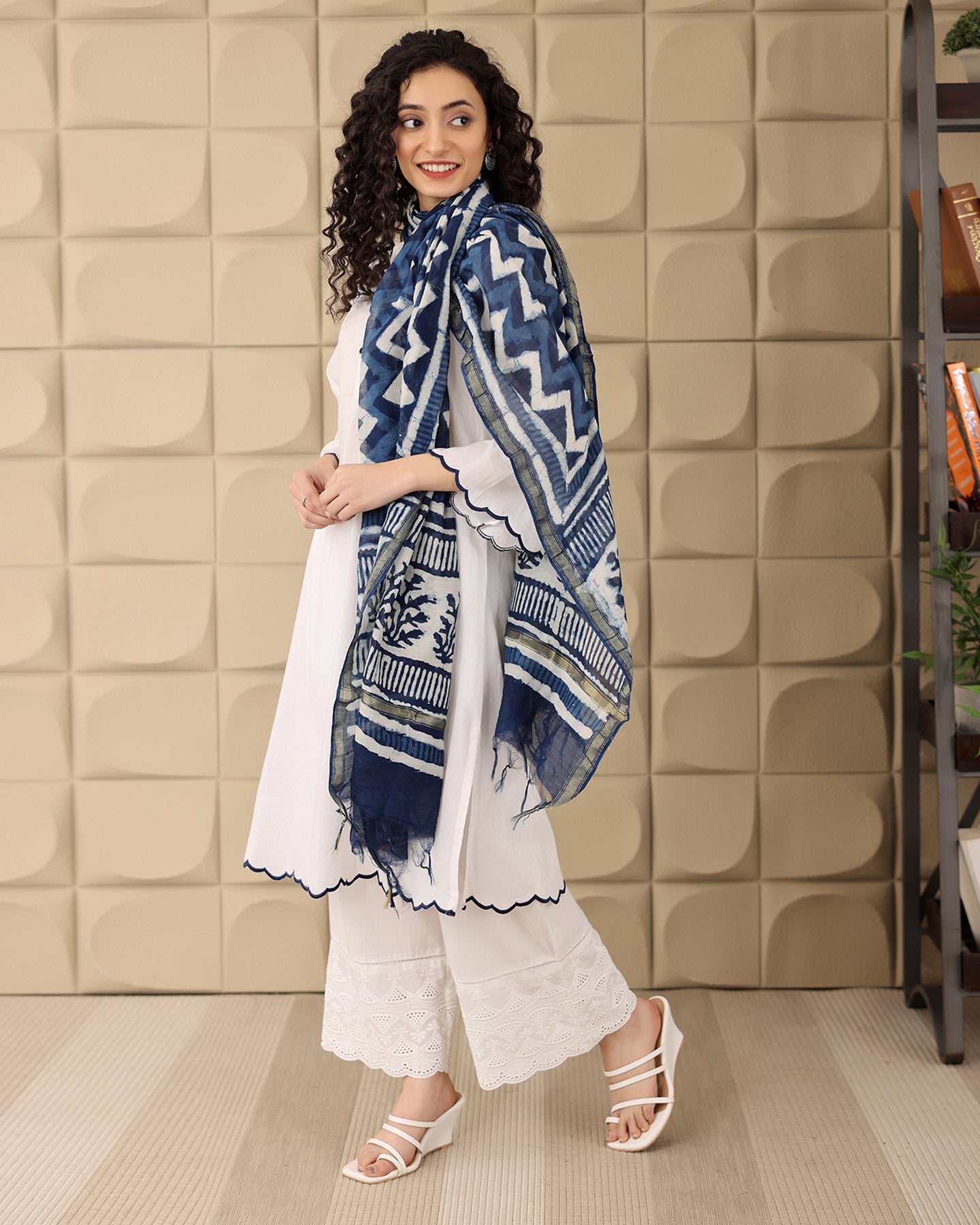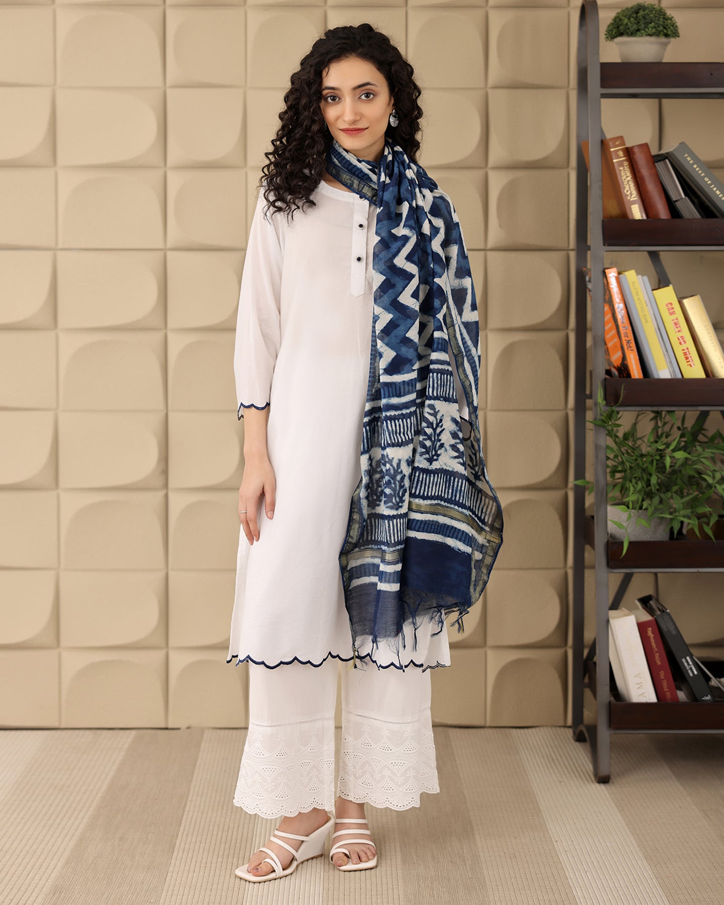 A classic white cotton A-line kurta, designed for those who appreciate simplicity with a twist. The printed dupatta adds a hint of charm to this otherwise minimalist piece, making it a versatile choice for your workday wardrobe.