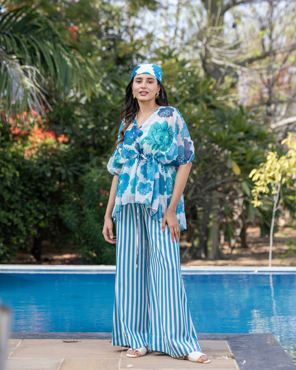 Step into sophistication with the White Floral & Stripes Co-ord Set, crafted from elegant organza fabric. This ensemble pairs subtle floral motifs with classic stripes and flared pants for a balanced, chic look perfect for any stylish occasion.