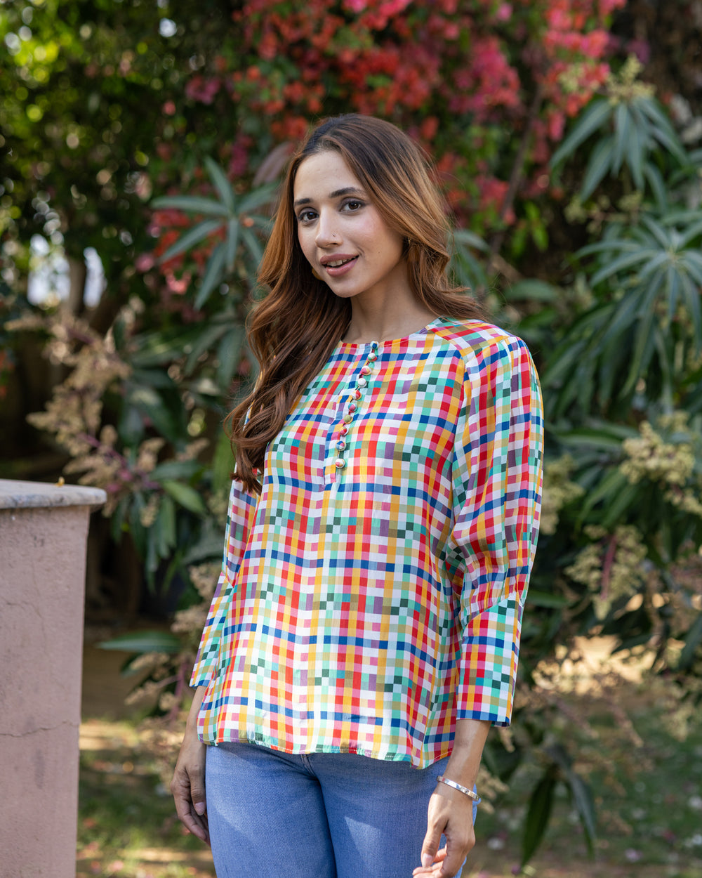 Show off a playful side with the White Multi-Hued Check Top, crafted in light crepe fabric. Its colorful checks on a crisp white background make it a cheerful choice for everyday style and comfort.