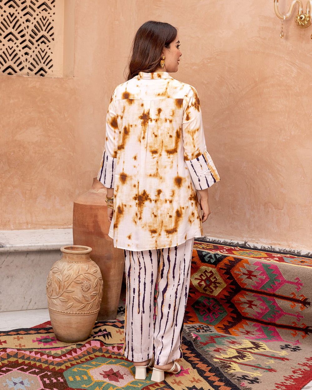 Serve a suave and oomph-worthy appeal in our breezy summer ensemble, accentuated with contemporary aesthetics and washed in a dopamine-inducing palette of off-white. Our 2-piece trendy co-ord set is crafted in a plush weave of rayon and includes a collared neck shirt top beaded with a contrasting tie dye print tale, and a pair of straight-fit bottoms.