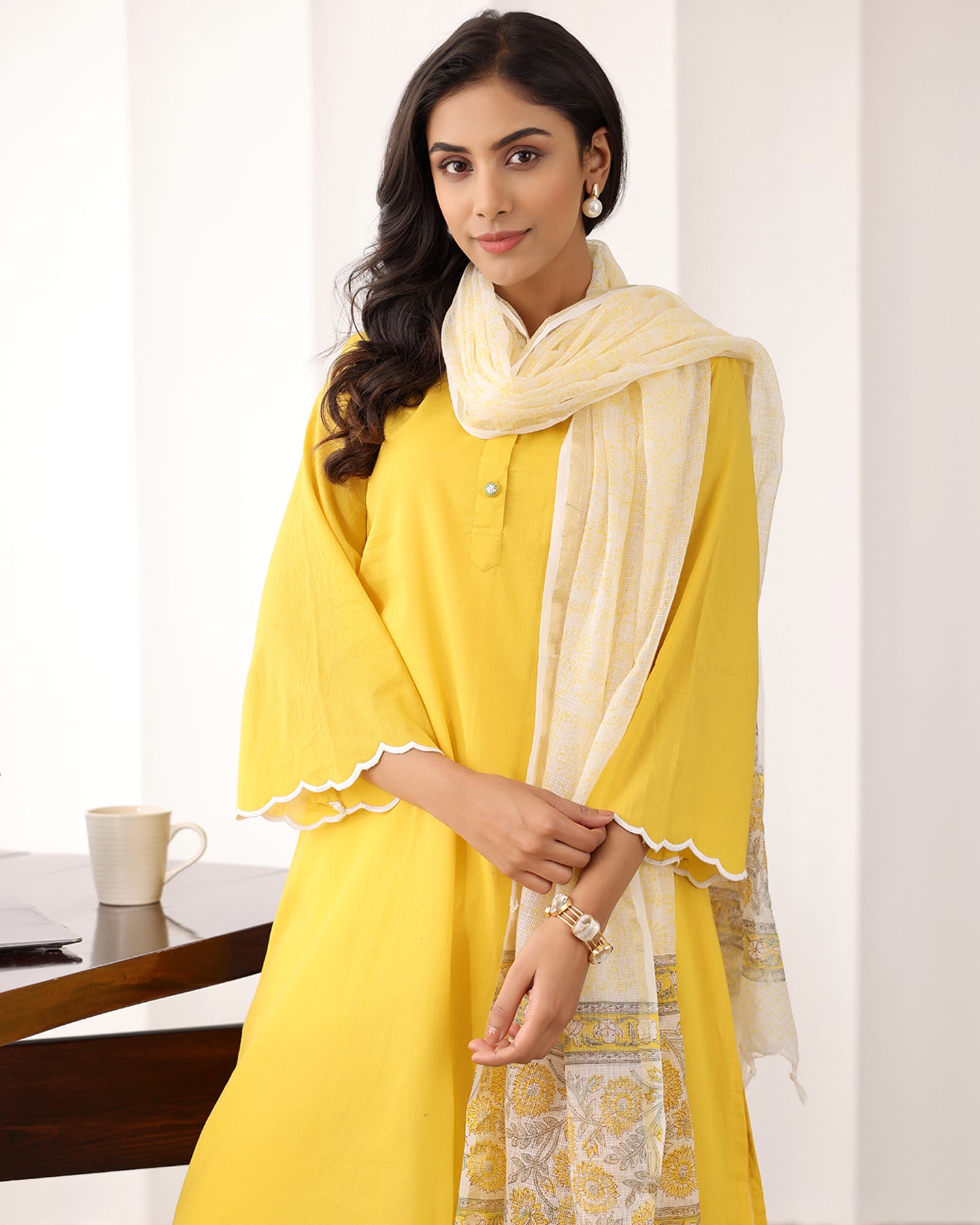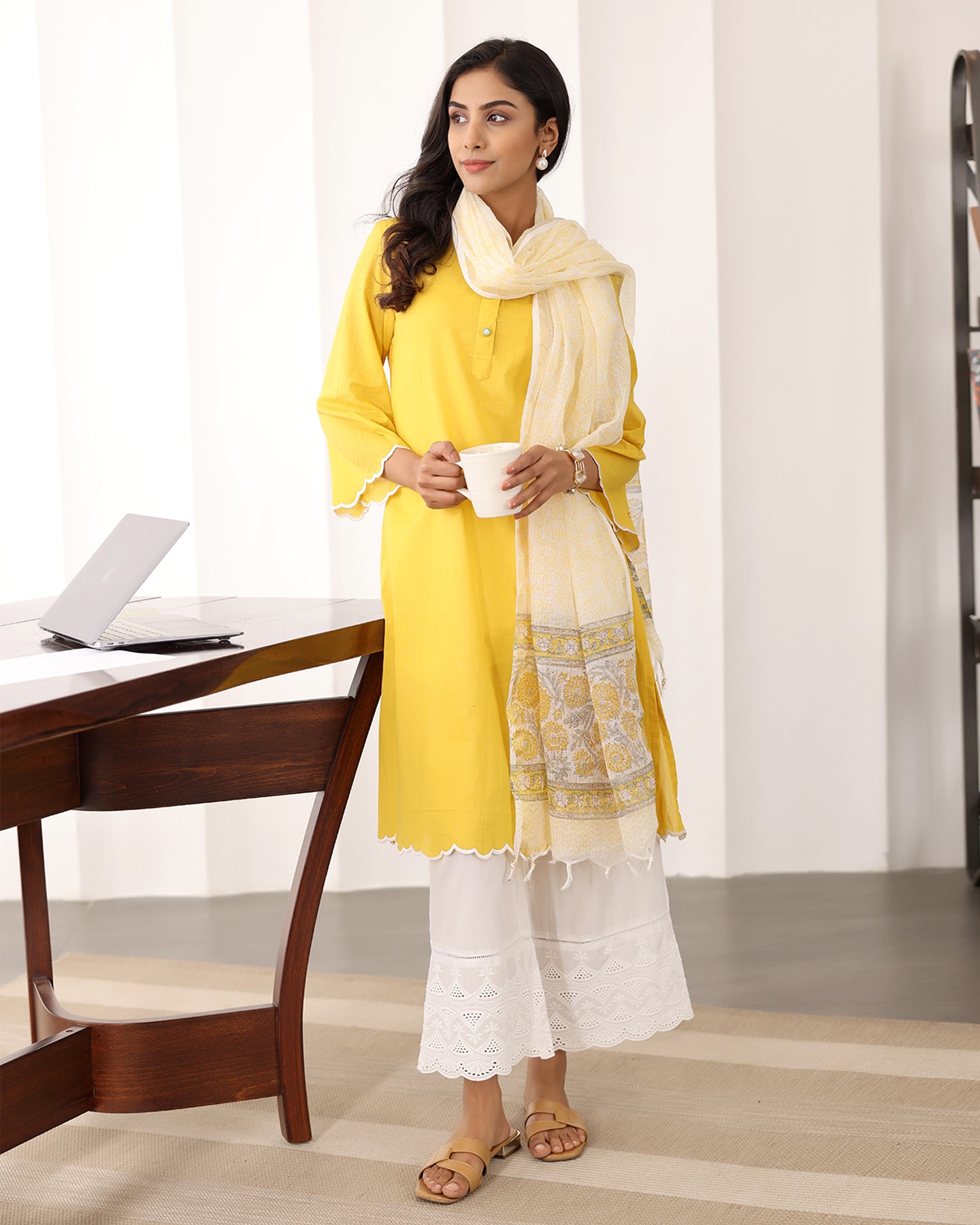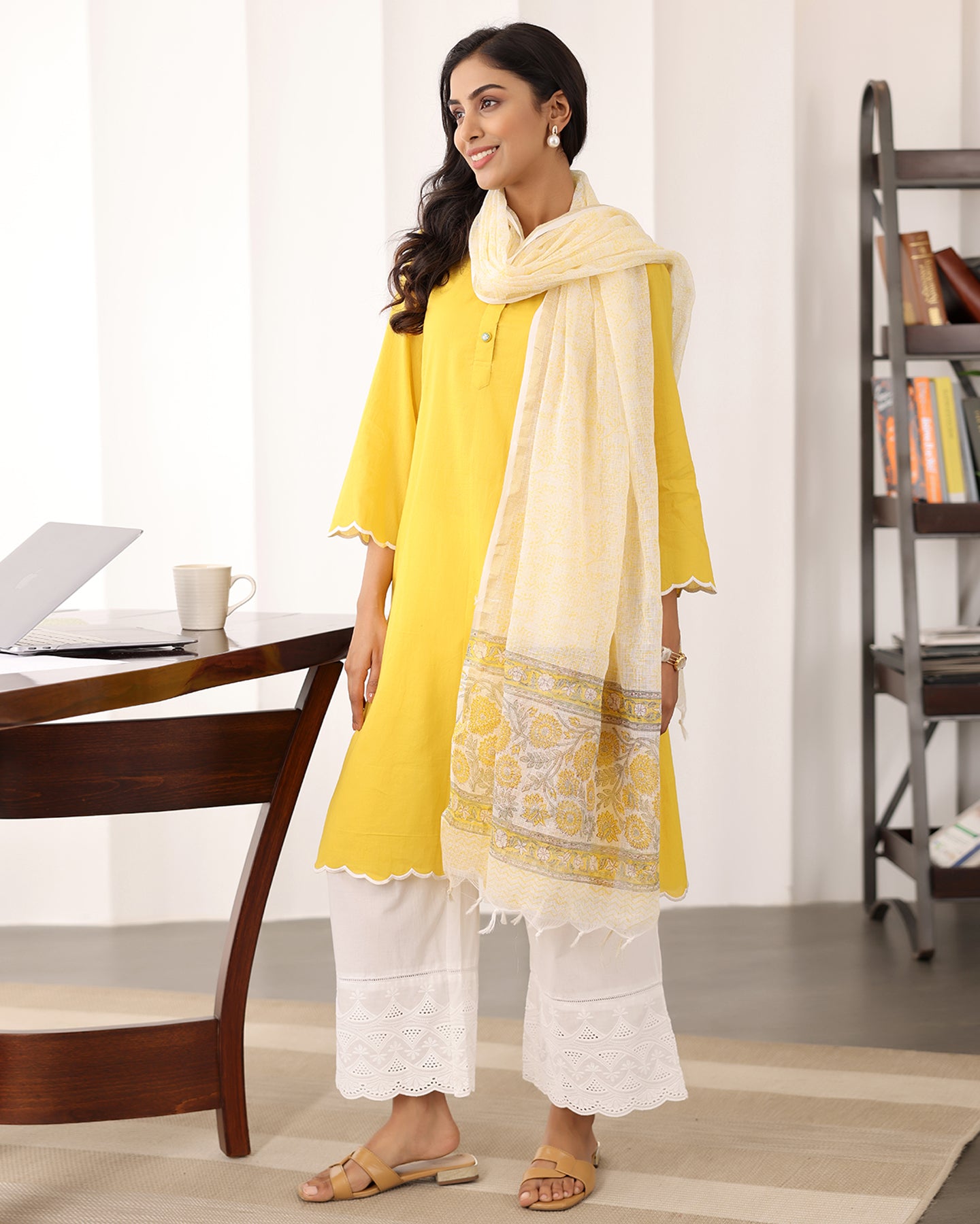 Brighten up your day with this fresh yellow cotton A-line kurta set, the flowy silhouette ensures comfort and elegance. Paired with a contrasting white printed dupatta, this set offers a beautiful balance of color and print, making it perfect for workwear.