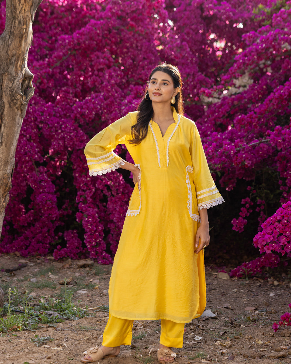 Make a statement at work with this sophisticated Yellow Lace Kurta Set, featuring luxe chanderi fabric and elegant lace accents.