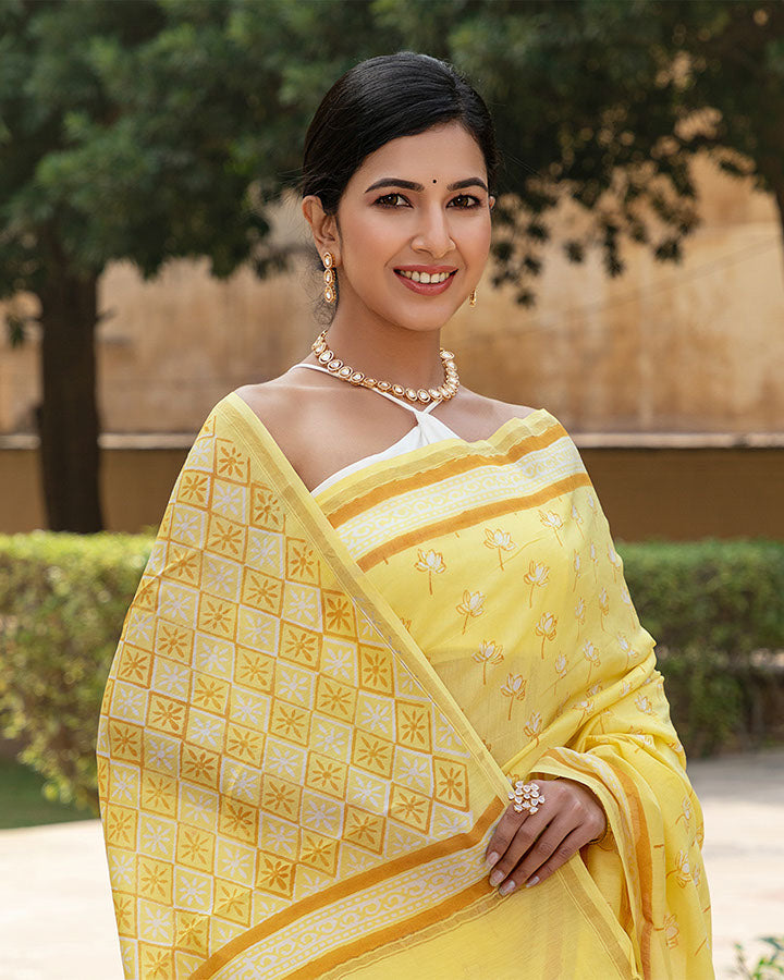 Bring in a little sunshine with this warm and breezy yellow saree. With vibrant colours and pretty lotus motifs, this chanderi saree will look gorgeous for a casual daytime event. You can style this saree according to the occasion you wear it for. Slay your #OOTD with this elegant and stylish drape.