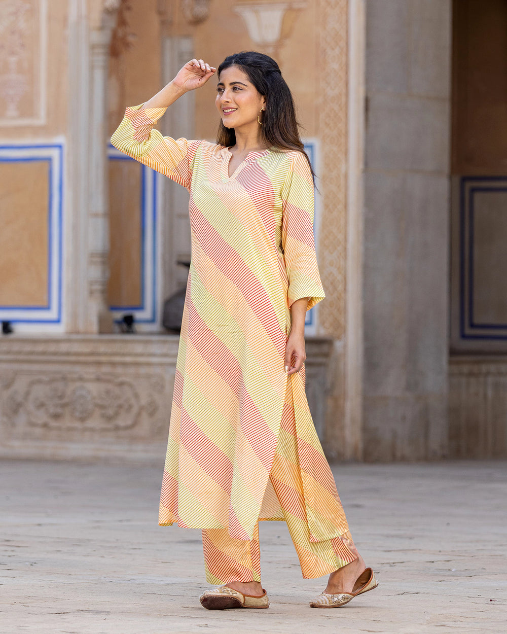 Embrace ease & elegance in our pastel yellow muslin kurta set. Crafted with finesse, our 2-piece ensemble features a v-neck straight kurta depicting charming stripe print play in contrasting hues and a pair of straight-fit pants. This contemporary fit is ideal for light festivities or a casual day-out.