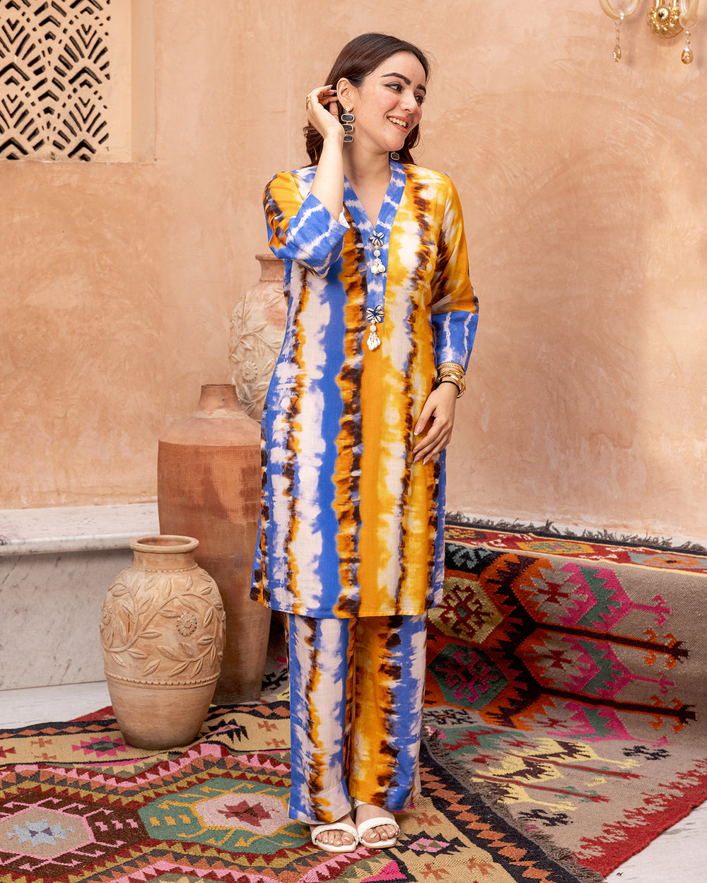 Serve a suave and oomph-worthy appeal in our breezy summer ensemble, accentuated with contemporary aesthetics and washed in a dopamine-inducing palette of yellow. Our 2-piece assorted kurta set is crafted in a premium weave of rayon and includes a V-neck straight-fit kurta beaded with tie dye print tale, and a pair of straight-fit bottoms.