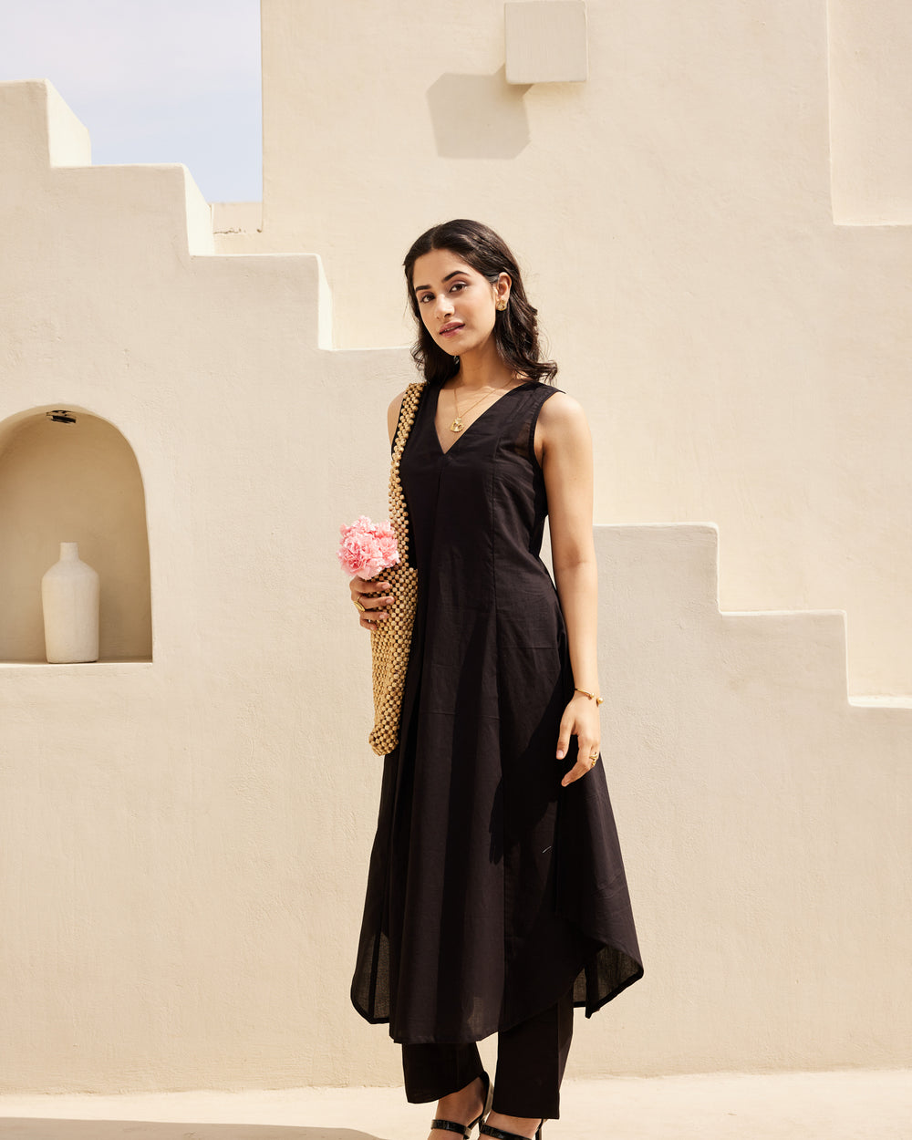Step out in style with the Black Basic Kurta Set, your go-to for a polished look. This ensemble features a V-neck A-line kurta made from soft cotton, designed for comfort and versatility. The straight pants complement the kurta, creating a streamlined silhouette. Ideal for any casual occasion, its solid pattern adds a touch of timeless elegance.