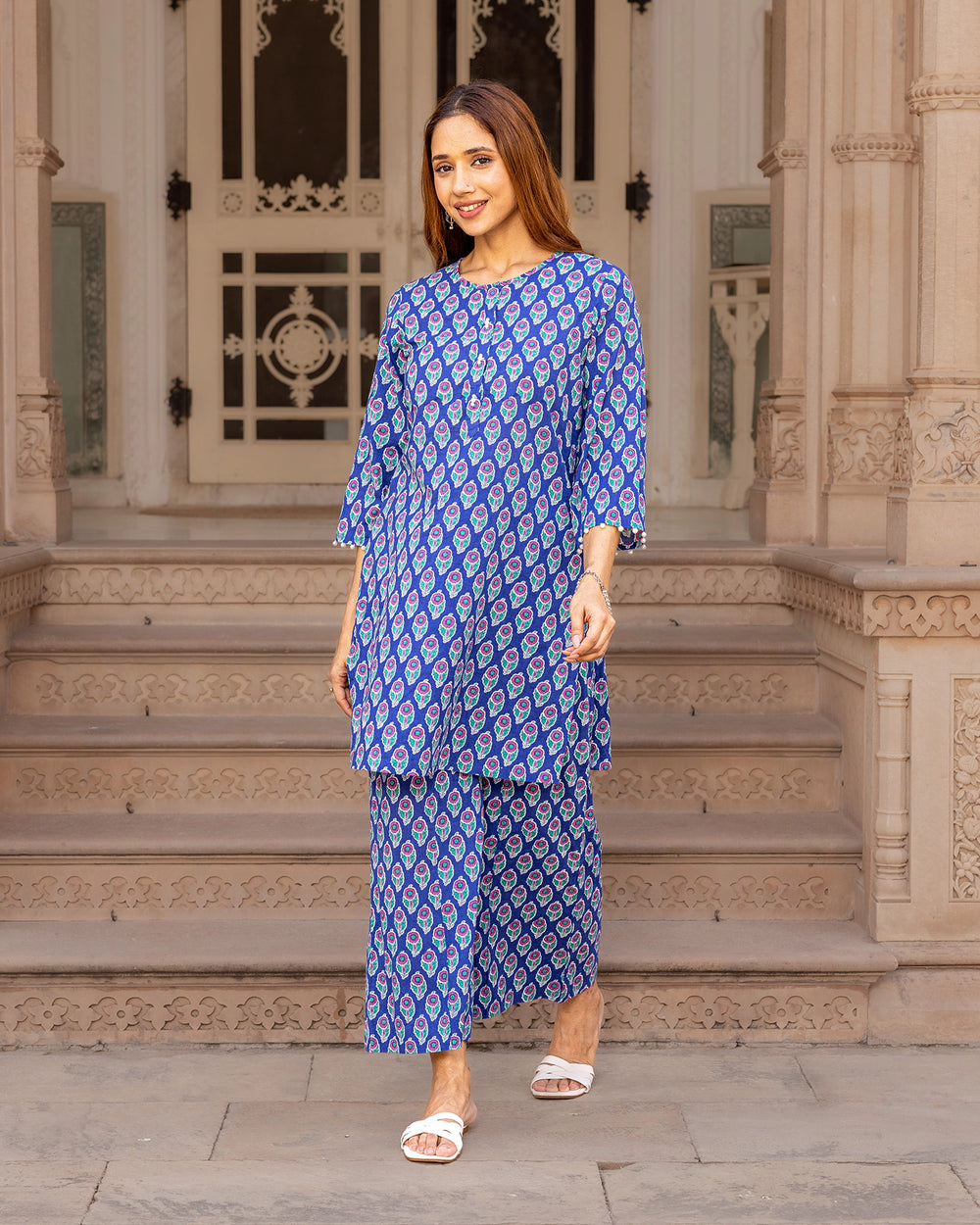 Embrace ease & elegance in our blue cotton kurta set. Crafted with finesse, our 2-piece ensemble features a round neck straight kurta depicting charming all-over print play in contrasting hues and a pair of straight-fit pants. This contemporary fit is ideal for light festivities or a casual day-out.