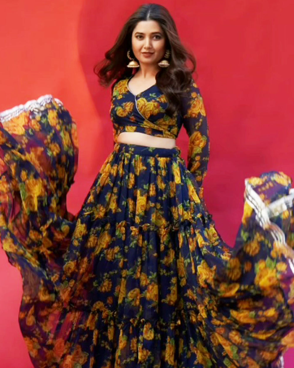 The three-tiered lehenga is adorned with delicate gota work at the hemline, creating a stunning and unique design. The flowy fabric of the lehenga adds a touch of elegance and sophistication to the ensemble, while the blue floral print complements the design of the blouse perfectly.