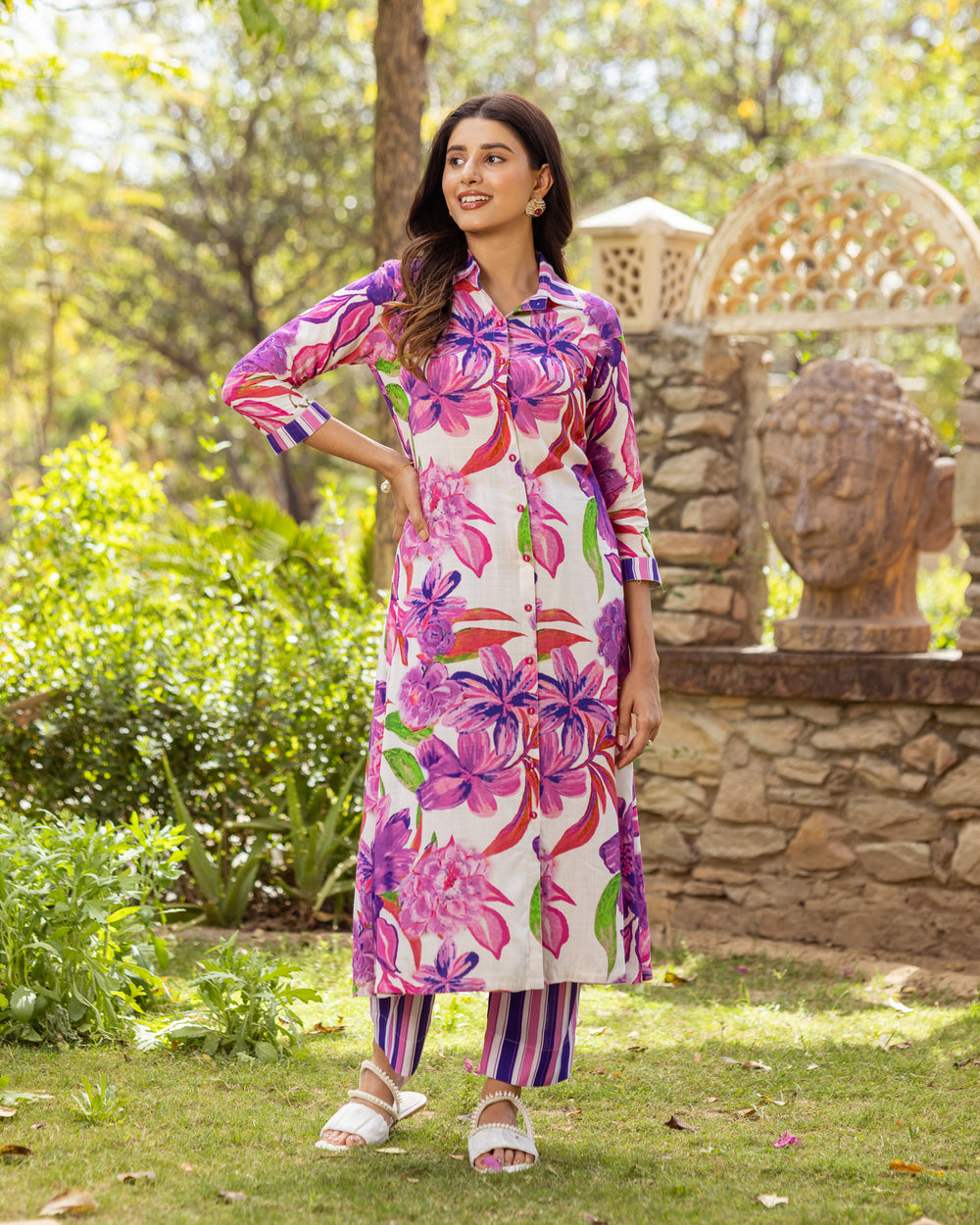 Take the show with this White Aquarelle Floral Co-ord Set. With the beautiful fit, this suit set is a perfect Indian outfit for every festival with stunning details of floral print on the go.