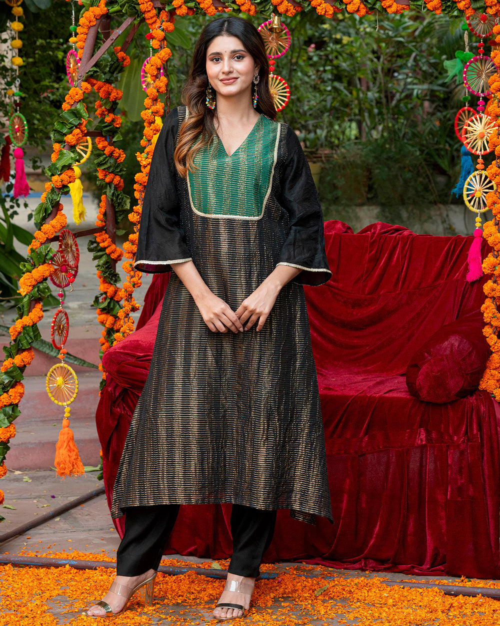 Demonstrate a regal appeal in our opulent black kurta set, embodying the charm of heritage craftsmanship in contemporary aesthetics. Crafted in plush chanderi fabrics, our v-necked 2-piece ensemble features an A-line self-embroidered kurta and a pair of straight-fit pants. Beaded in time-honoured weaves, this sumptuous fit is apt for light festivities.