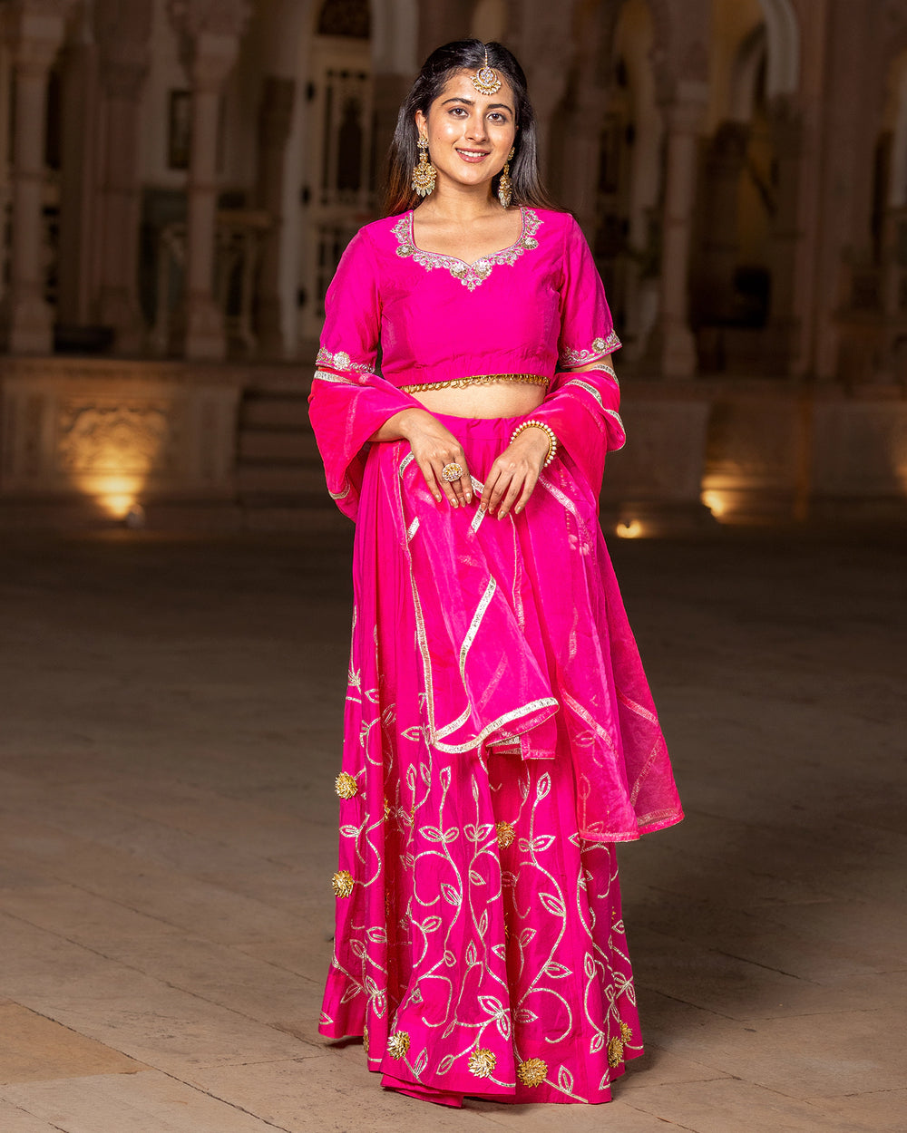 Embrace the sartorial elegance in our pink chiffon lehenga set. Crafted with finesse, our 3-piece sumptuous ensemble features a round neck solid blouse with tassels, a tiered skirt, and a stunning gota ornated dupatta. This contemporary fit is ideal for wedding festivities.