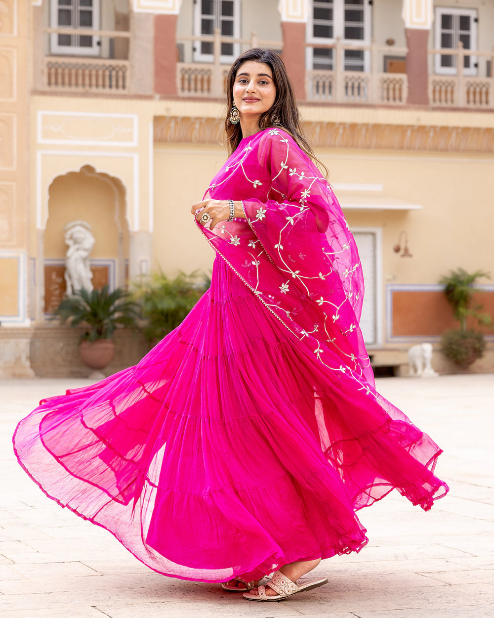 Embrace the sartorial elegance in our pink chiffon lehenga set. Crafted with finesse, our 3-piece sumptuous ensemble features a round neck solid blouse with tassels, a tiered skirt, and a stunning gota ornated dupatta. This contemporary fit is ideal for wedding festivities.