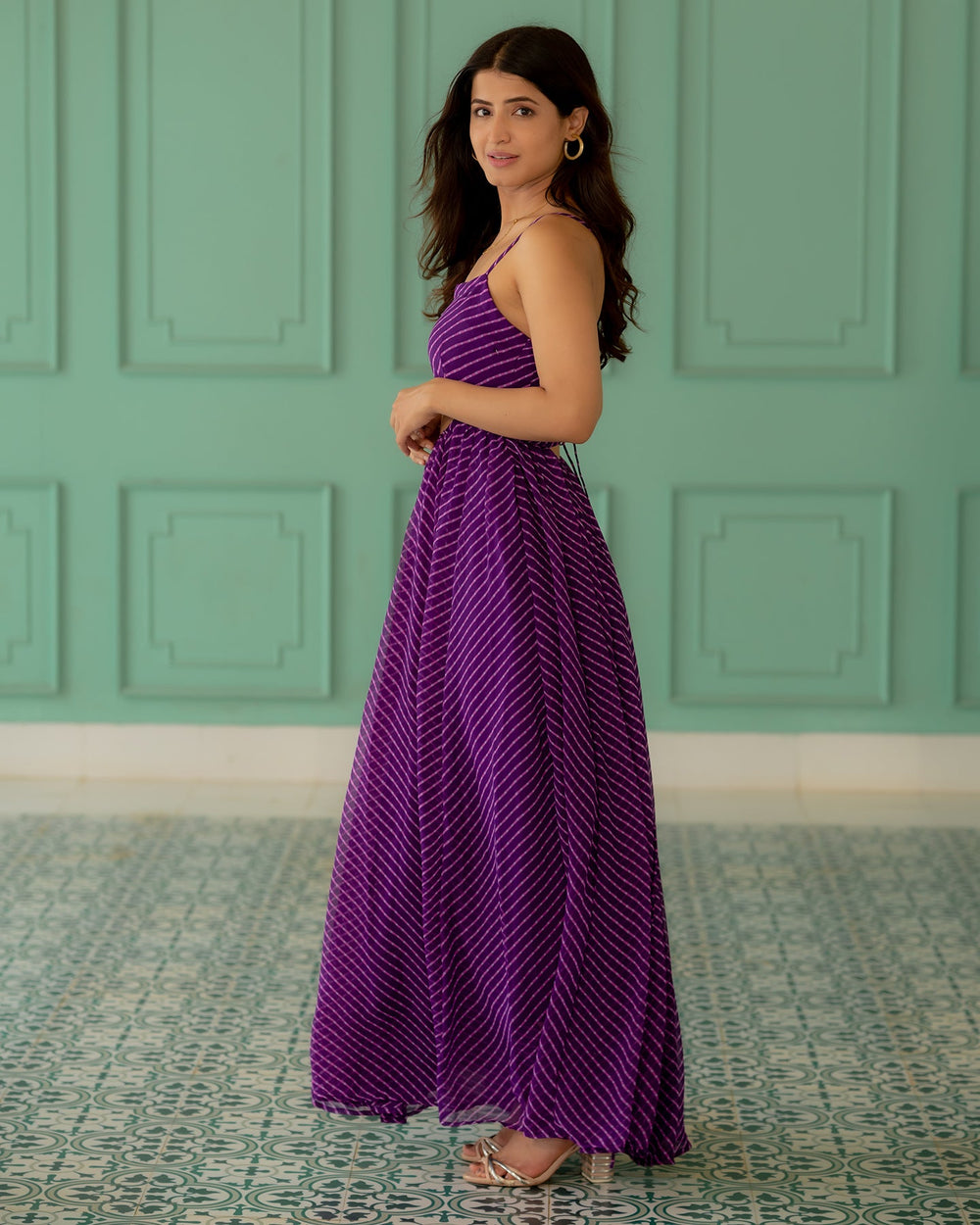 Our purple chiffon gathered maxi dress features heritage leheriya print tale and is elevated by strappy sleeves and a sweetheart neckline. A stunning fusion number, essaying a story of statement cut-out detail and flattering flare, is a perfect pick for a day soiree.