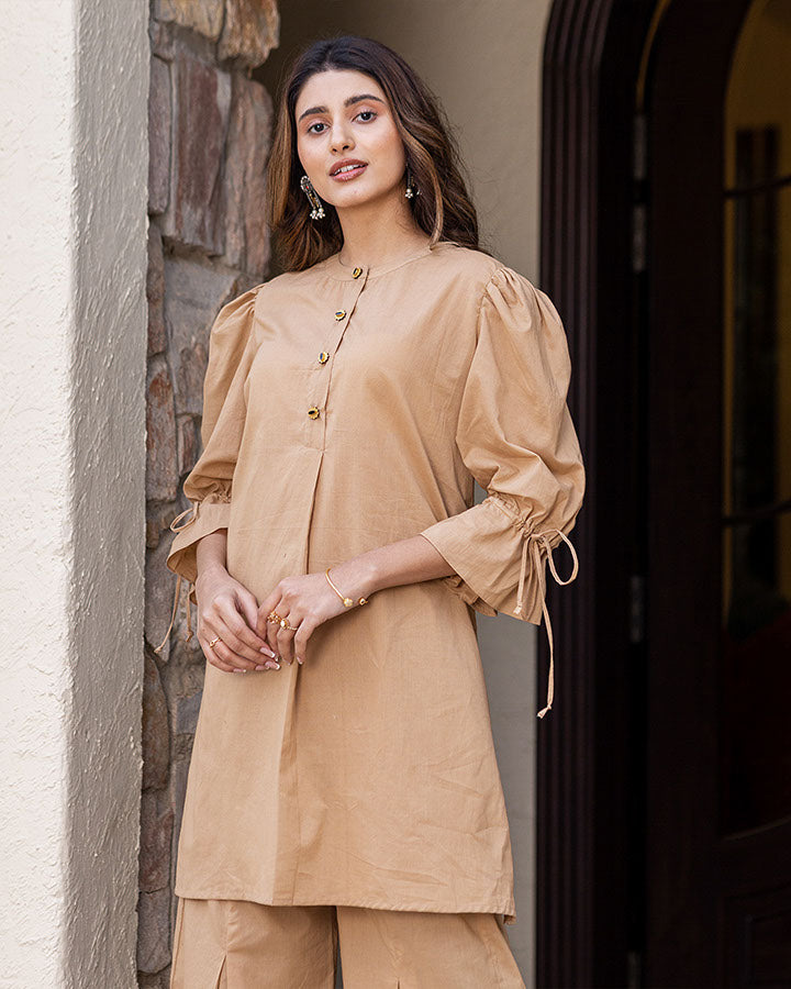 Subtle and breezy, this earthy toned coord set will have you feeling like summer was never over. featuring puffed up sleeves drawstring element, beautiful buttons and its easy wear silhouette, this coord is perfect for your next vacation.