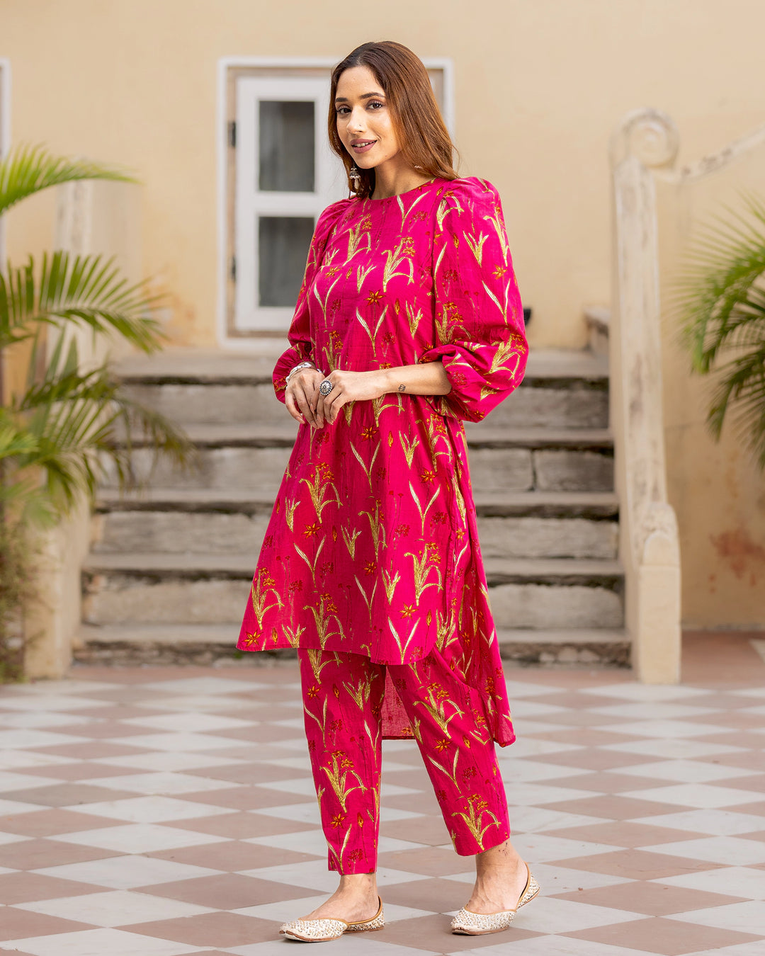 Embrace ease & elegance in our fuschia pink cotton kurta set. Crafted with finesse, our 2-piece ensemble features a round neck straight kurta depicting charming handblock floral print play in contrasting hues and a pair of straight-fit pants. This contemporary fit is ideal for light festivities or a casual day-out.