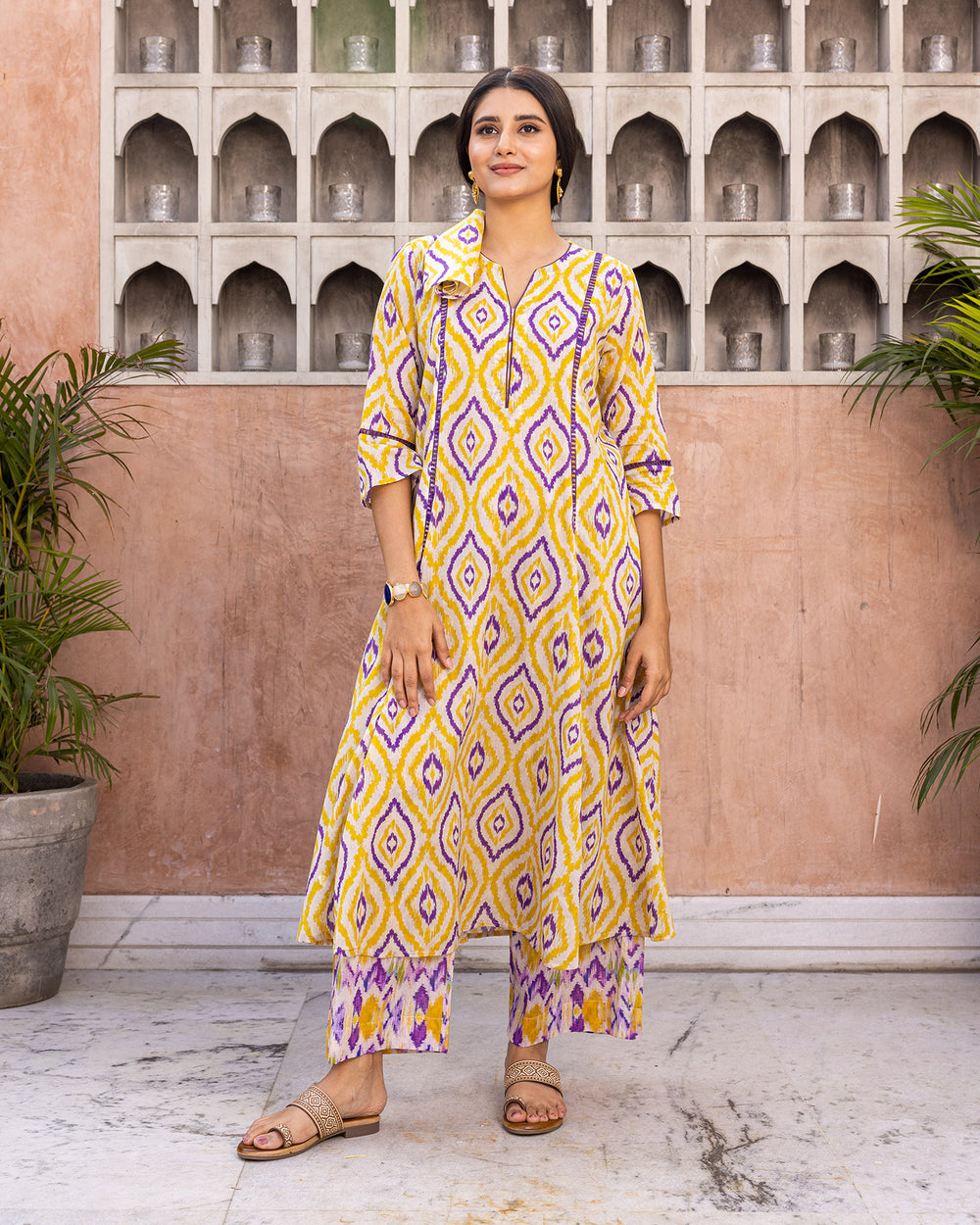 Serve a suave and oomph-worthy appeal in our breezy summer ensemble, accentuated with contemporary aesthetics and washed in a dopamine-inducing palette of yellow. Our 2-piece assorted kurta set is crafted in a treasured weave of quality cotton and includes a round neck A-line kurta beaded with an Ikat print tale, and a pair of straight-fit bottoms.