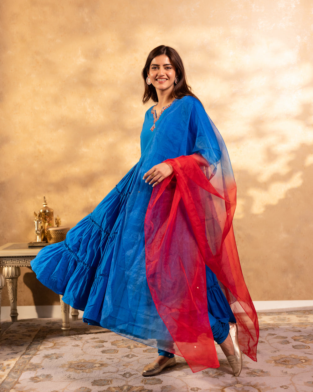 The Royal blue suit set is crafted from breathable cotton fabric, features a tiered kurta adorned with intricate handwork along the neckline. Paired with a churidaar bottom and a contrasting red dupatta.
