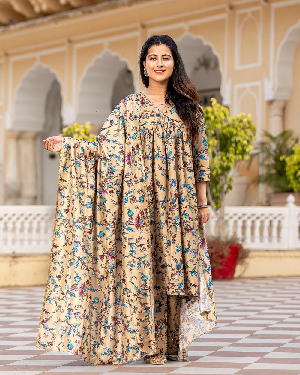 Embrace elegance in our beige muslin kurta set. Crafted with finesse, our 2-piece ensemble features a v-neck gathered high-slit kurta depicting charming Kalamkari print tale and a pair of straight palazzo pants. This contemporary fit is ideal for day festivities.