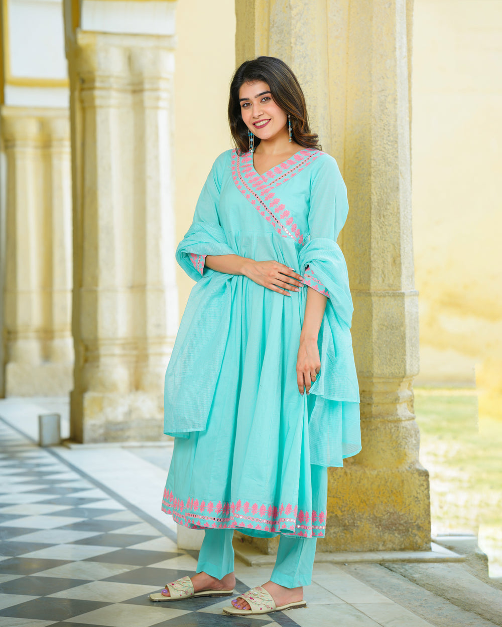 Stand out in the crowd with our blue summer suit set, with a pattern that is sure to catch everyone's eye. Our 3-piece set includes a vneck kalidaar kurta, straight pants bottoms, and a matching dupatta.