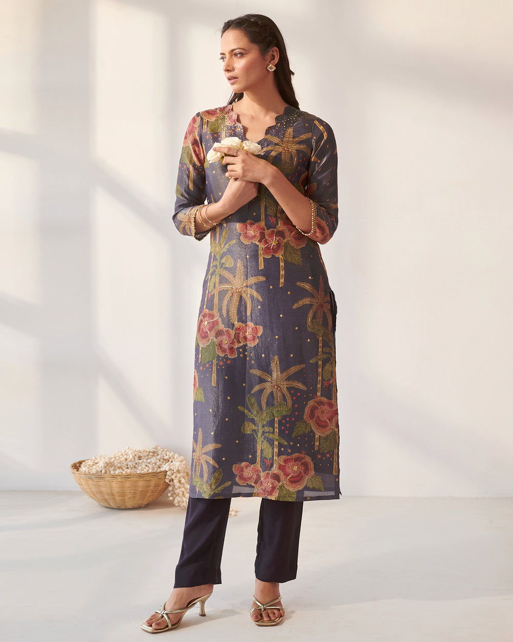 Indulge in our signature creation, encapsulating timeless design aesthetics illustrated with contemporary accents. The 2-piece tailored-to-finesse blue kurta set is crafted in time-honored tissue weave and includes a v-neck straight-fit kurta beaded with enchanting floral print and gota adornments and a pair of straight-fit bottoms. This stunning ensemble is apt for a wedding festivity.
