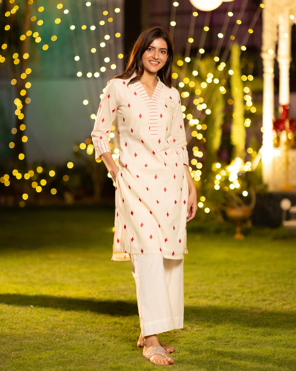 The Diamond Charm Co-ord set stands out with its eye-catching red diamond prints spread across the kurta. The kurta is accentuated with fine red thread embroidery on the neckline and sleeves. The solid straight pants complete the look.