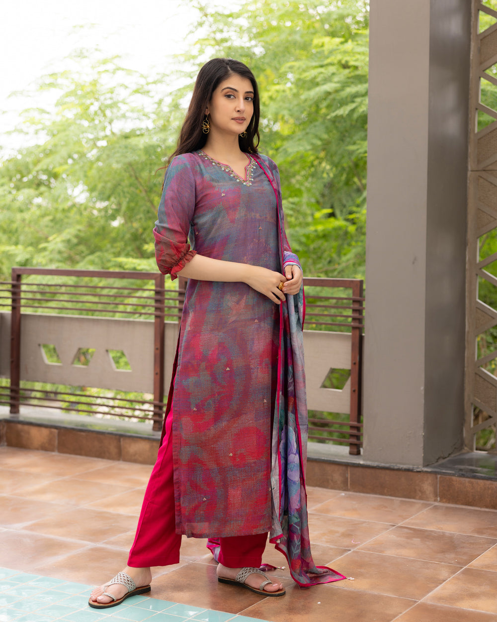 This Floral Fusion Suit Set features a sleek straight kurta adorned with bold floral prints and a delicately embroidered V-neckline. Feminine puff sleeves add a touch of softness, while the matching dupatta and straight pant complete the look.