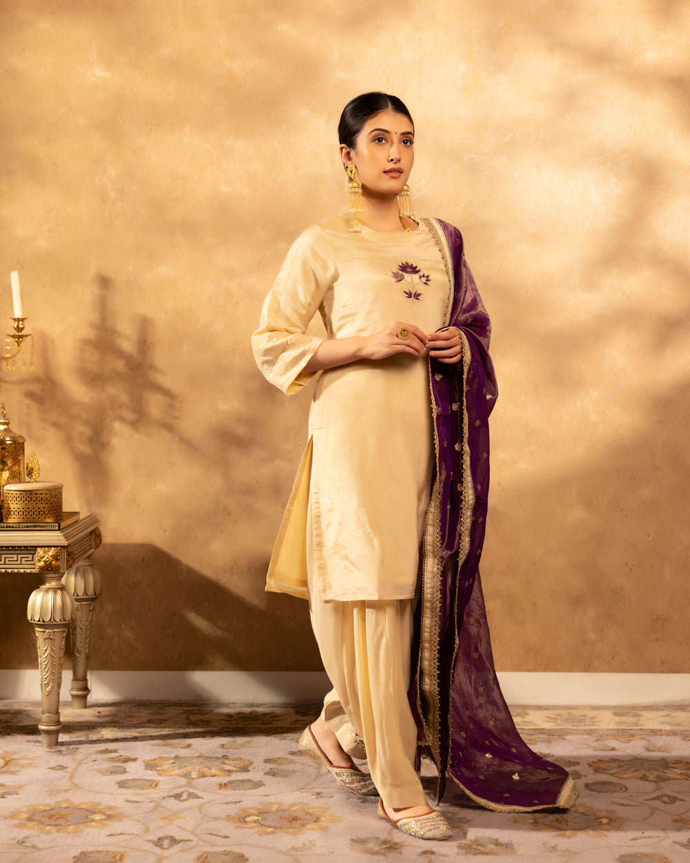 This Golden Glow suit set has a beige tissue kurta featuring elegant handwork detailing on the front and a classic round neckline. Paired with matching salwar and a contrasting purple dupatta, this set exudes a subtle festive appeal.