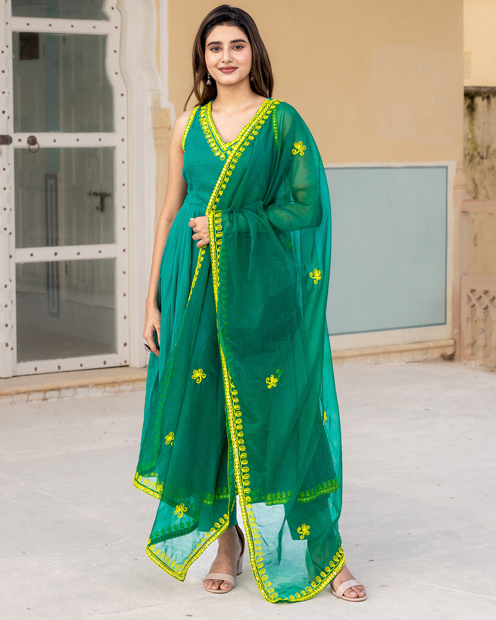 Embrace elegance in our dark green kota doria suit set. Crafted with finesse, our 3-piece ensemble features a v-neck Anarkali kurta embellished with floral Aari embroidery in a contrasting tone, a pair of straight-fit pants, and a stunning ornated dupatta. This contemporary fit is ideal for day festivities.