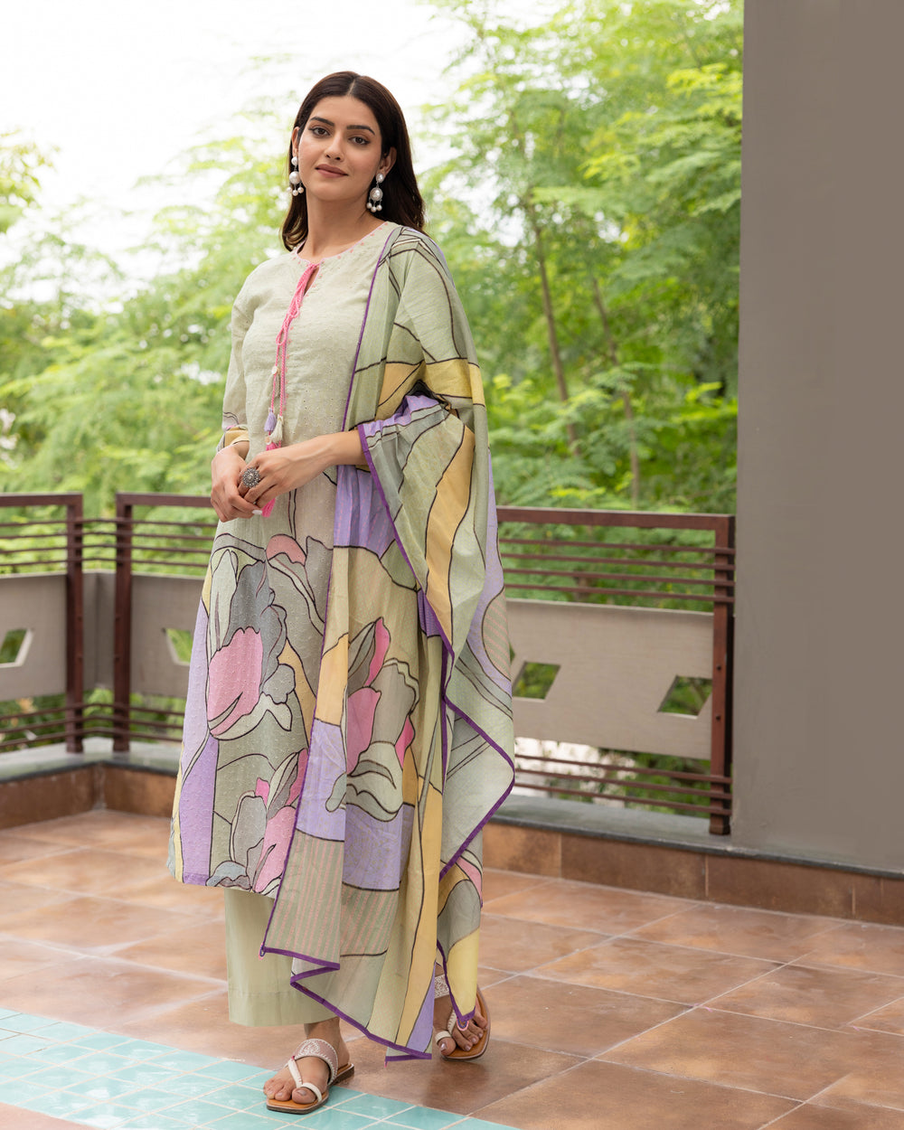 This Green Delight Suit Set is designed with soft floral print, crafted from lightweight cotton fabric. The kurta is paired with matching straight pants, and beautifully complemented by a printed dupatta.