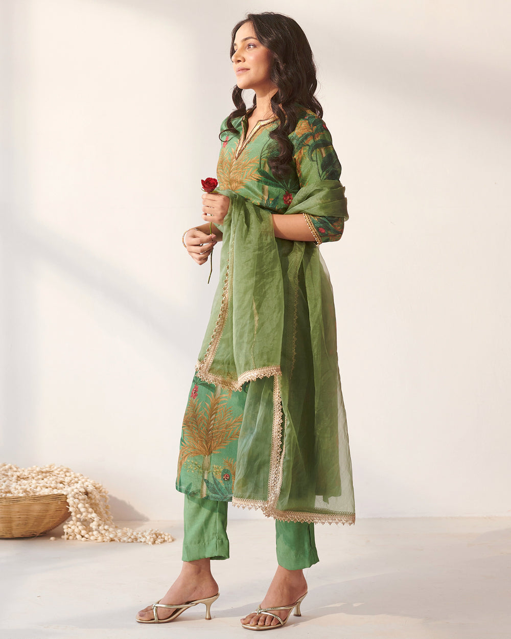 Indulge in our signature creation, encapsulating timeless design aesthetics illustrated with contemporary accents. The 3-piece tailored-to-finesse green suit set is crafted in time-honored tissue weave and includes a key-hole neck straight-fit kurta beaded with foliage print and gota adornments, a pair of straight-fit bottoms, and a dupatta. This stunning ensemble is apt for a wedding festivity.