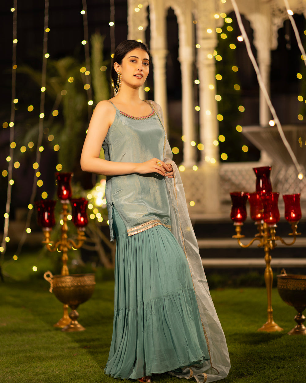 Elevate your style with Shimmer Sharara Set, featuring a light green strappy kurta, beautifully crafted from tissue fabric and adorned with delicate embroidery at the neckline and hem. Paired with turquoise sharara pants and a dupatta to complete the look.