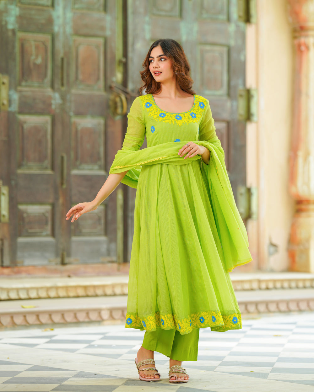 Dive into the festive spirit with our neon summer suit set, ensuring you look your best at all times. Our 3-piece set includes a round neck kalidaar kurta, straight pants bottoms, and a matching dupatta.