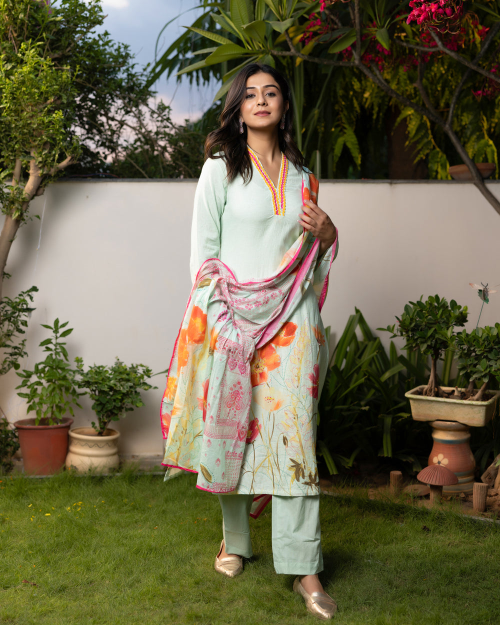 This Minty Fresh Suit Set features a straight-fit kurta with floral prints, beautifully complemented by embroidered neckline and yoke. Paired with matching straight pants and a printed dupatta, it’s the ideal choice for casual outings or festive events.
