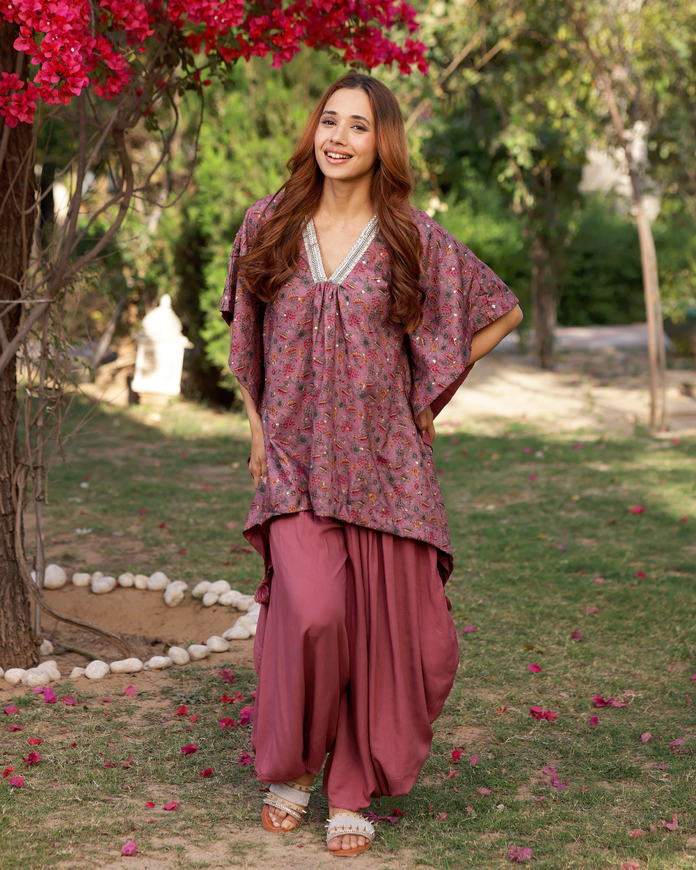 Embrace ease & elegance in our mizuki kalamkari kurta set. Crafted with finesse, our 2-piece ensemble features a v-neck kaftan kurta depicting charming kalamkari print play in contrasting hues and a pair of flared asymmetric pants. This contemporary fit is ideal for light festivities or a casual day-out.