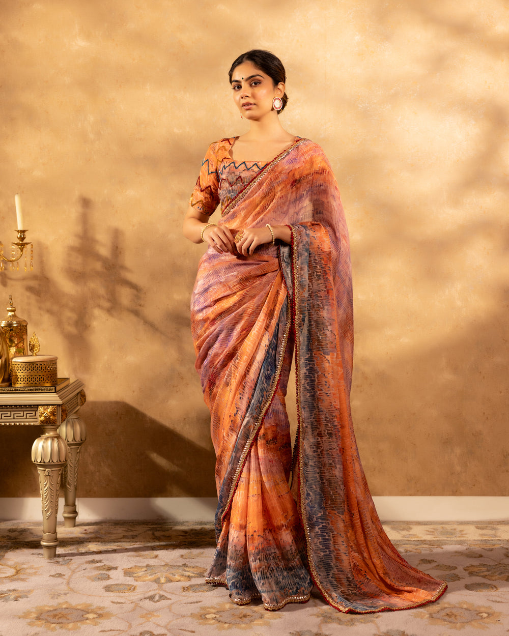 This Abstract Printed Saree is crafted from soft chinnon fabric, features bold abstract prints that give it a modern and artistic vibe. The saree is enhanced with a sleek lace border. The saree comes with an unstitched blouse featuring embroidery details.