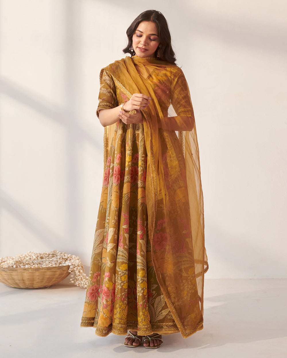 Indulge in our signature creation, encapsulating timeless design aesthetics illustrated with contemporary accents. The 2-piece tailored-to-finesse mustard suit set is crafted in time-honored tissue weave and includes a v-neck Anarkali kurta beaded with mythical floral print and gota adornments, and a dupatta. This stunning ensemble is apt for a wedding festivity.