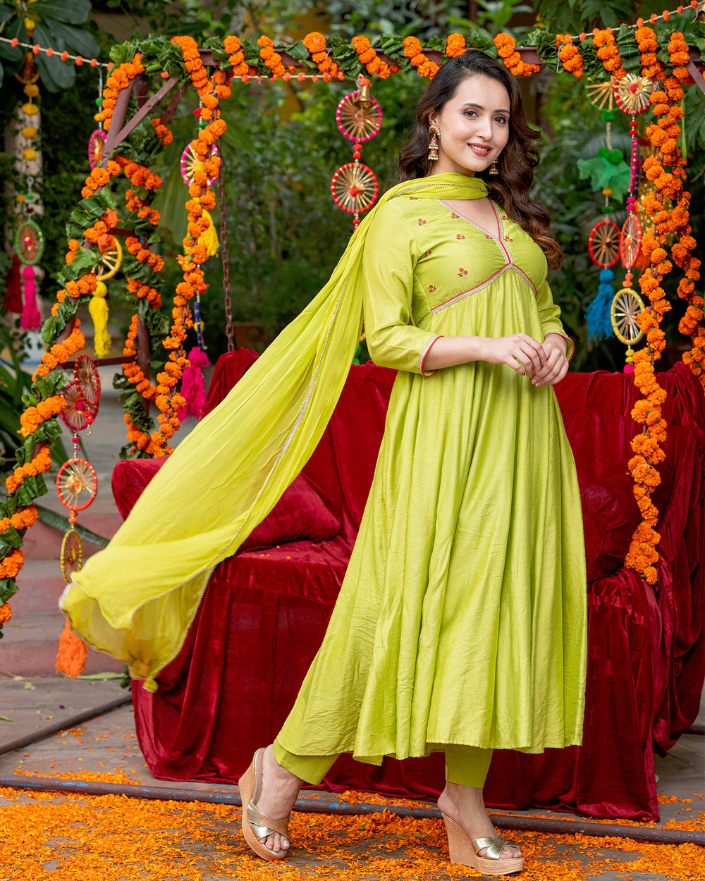 Demonstrate a regal appeal in our opulent neon green suit set, embodying the charm of heritage craftsmanship in contemporary aesthetics. Crafted in plush chanderi fabric, our v-neck 3-piece ensemble features a kalidaar embroidered kurta, a straight-fit pants and, a dupatta. Beaded in-vogue palette, this sumptuous fit is apt for family gatherings or daytime festivities