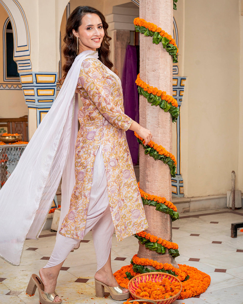 Demonstrate a regal appeal in our opulent off-white suit set, embodying the charm of heritage craftsmanship in contemporary aesthetics. Crafted in plush chanderi fabric, our round neck 3-piece ensemble features a straight kurta with all-over floral notes and embroidery, a pair of tulip-cut pants and a dupatta. Beaded with refreshing take on silhouette, this sumptuous fit is apt for daytime festivties.