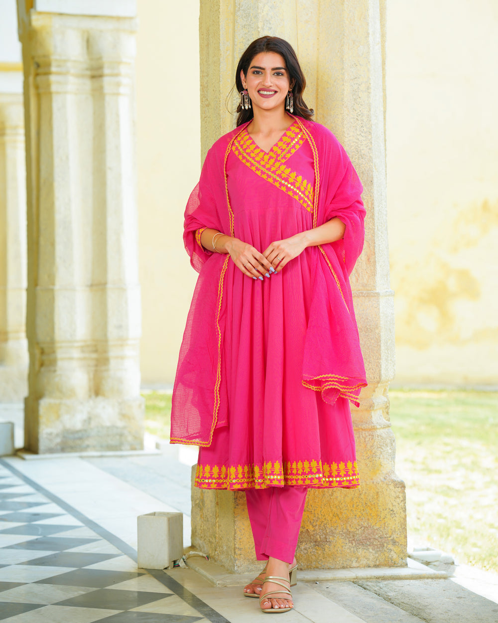 Indulge in the elegance of our pink summer suit set, a perfect blend of modern design and traditional charm. Our 3-piece set includes a v-neck kalidaar kurta, straight pants bottoms, and a matching dupatta.