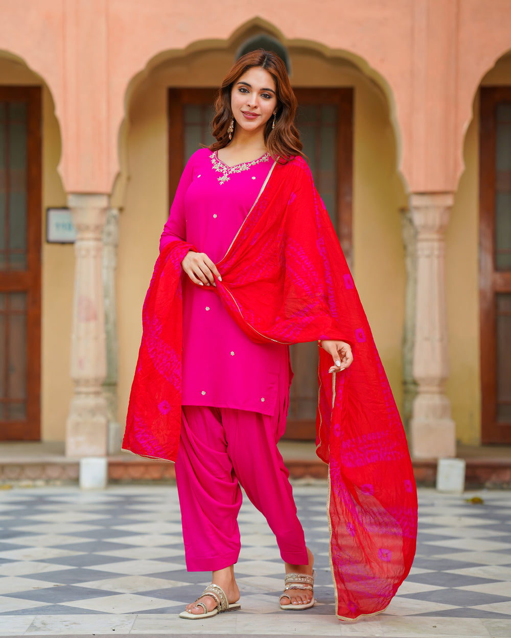 Step into elegance with ourPink Kalidaar Embroidered Suit Set. This delightful suit set features a sweetheart neckline and 3/4th sleeves, making it a perfect choice for festive gatherings. The kalidaar pattern adds a traditional flair, while the intricate embroidery enhances its beauty. Crafted from high-quality rayon, this suit set includes comfortable salwars, ensuring you look and feel fabulous at any event.