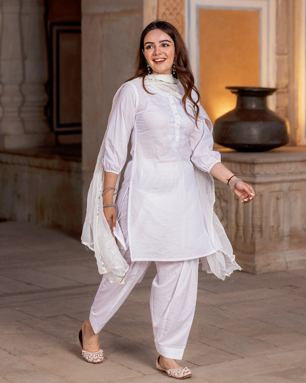 Embrace elegance in our white cotton salwar suit set. Crafted with finesse, our 3-piece ensemble features a round neck straight kurta depicting charming embroidery, a pair of salwar pants, and a stunning dupatta. This contemporary fit is ideal for day festivities.