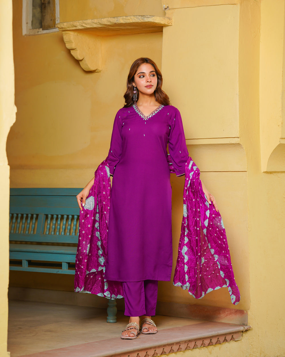 Make a grand entrance with our Purple Embroidered Suit Set. This sophisticated suit set features a V-neckline and 3/4th sleeves, perfect for any festive occasion. The straight pattern provides a sleek silhouette, while the detailed embroidery showcases exquisite craftsmanship. Made from premium rayon fabric, this suit set includes straight pants, making it a versatile addition to your festive wardrobe.