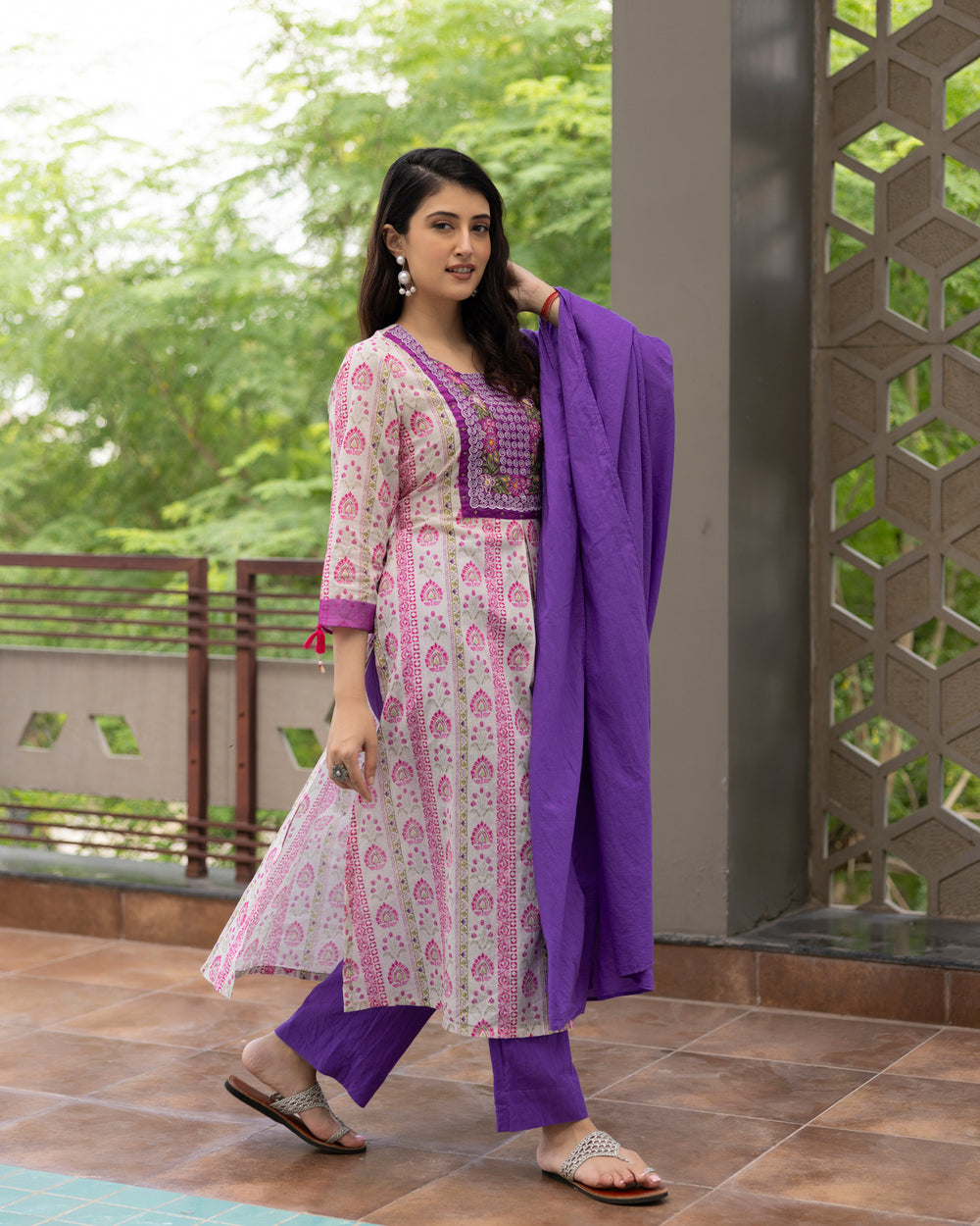 This Purple Suit Set is a perfect blend of comfort and style. The kurta showcases an eye-catching geometric print, and an embroidered yoke. The set is completed with straight-fit pants and a matching dupatta.