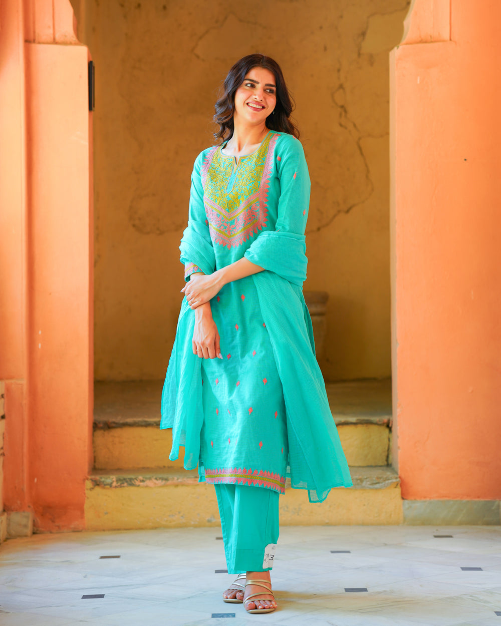 Unveil the beauty of our blue summer suit set, a perfect blend of modern design and traditional charm. Our 3-piece set includes a nan neck straight kurta, straight pants bottoms, and a matching dupatta.