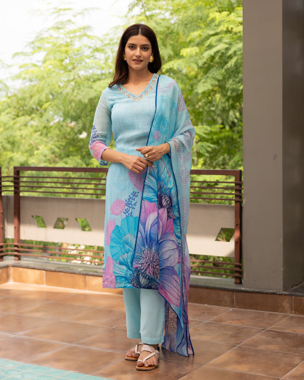 The Sky Blossom Suit Set features an A-line kurta, with an embroidered neckline. The floral print that adds a fresh feel to both the kurta and the coordinated dupatta. The set is completed with a straight fit pant.