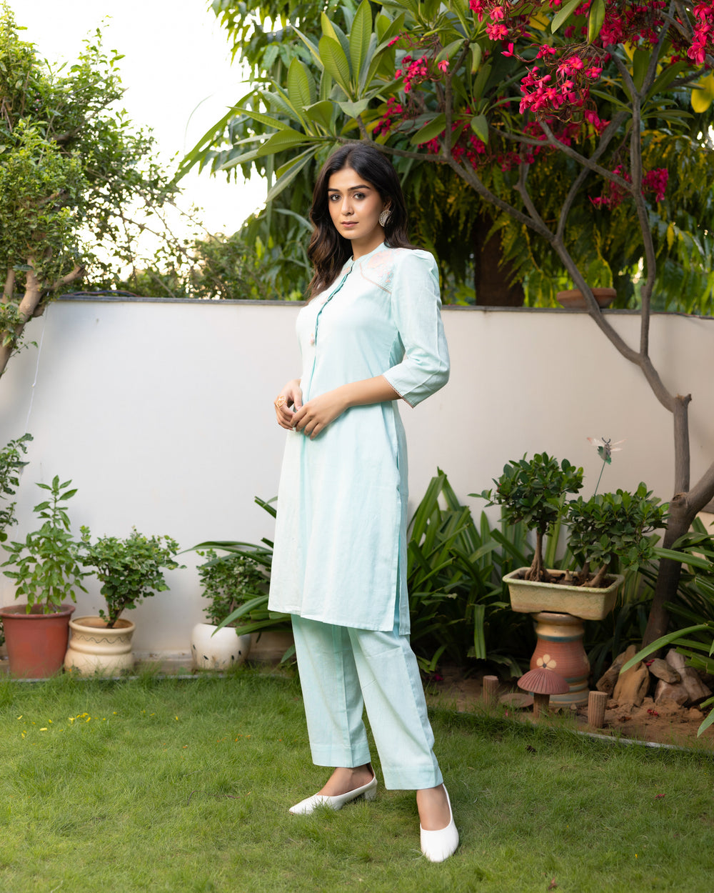 Style Tips: Complete your look with delicate pearl jewellery and a pair of strappy flats or juttis.