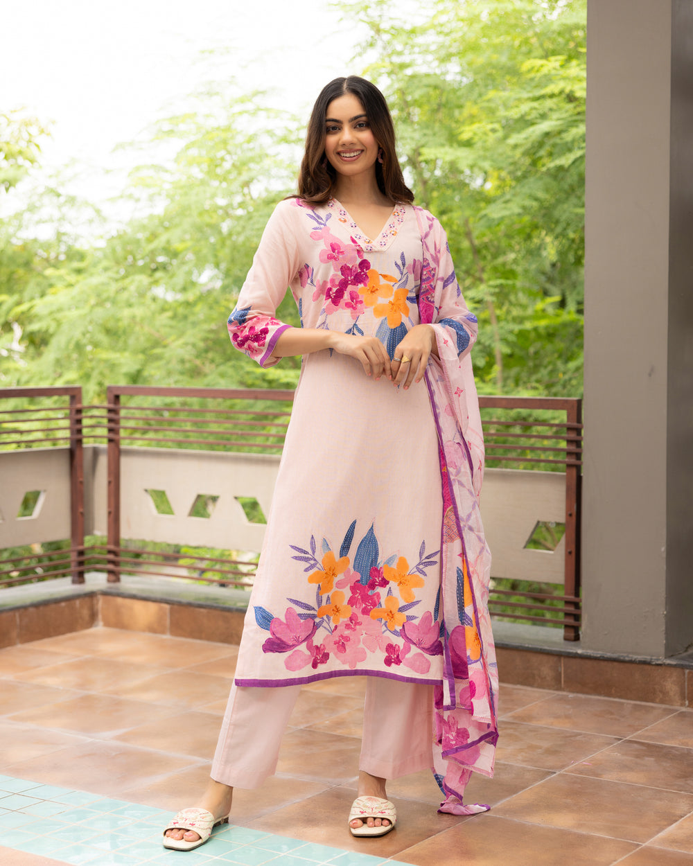 This Printed Suit Set features a straight-fit kurta with a charming floral print in soft pink hue, enhanced by intricate embroidery on the neckline and yoke. The kurta is paired with straight pants and a printed dupatta.