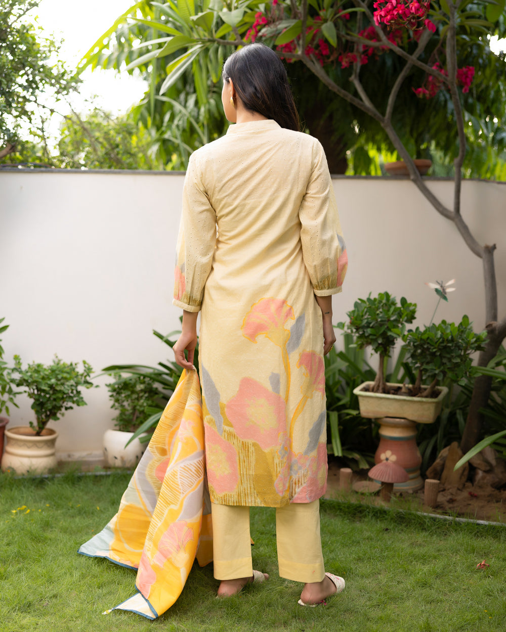 The suit set features a straight kurta showcasing a fresh floral print, crafted from soft cotton fabric. Paired with matching straight pants, this ensemble is complemented by a printed dupatta that adds a lively touch.