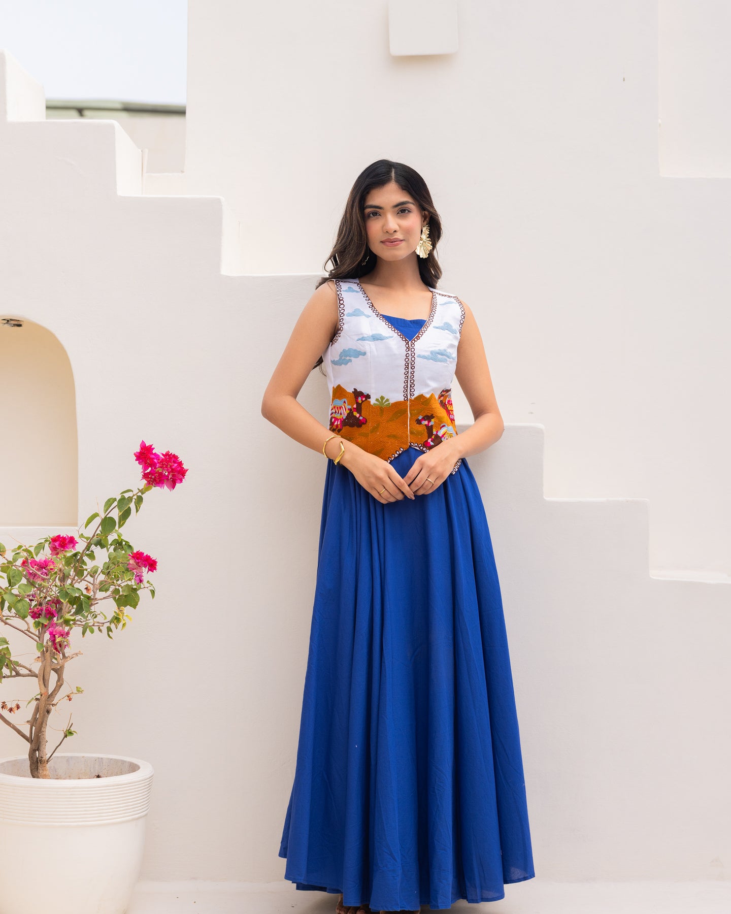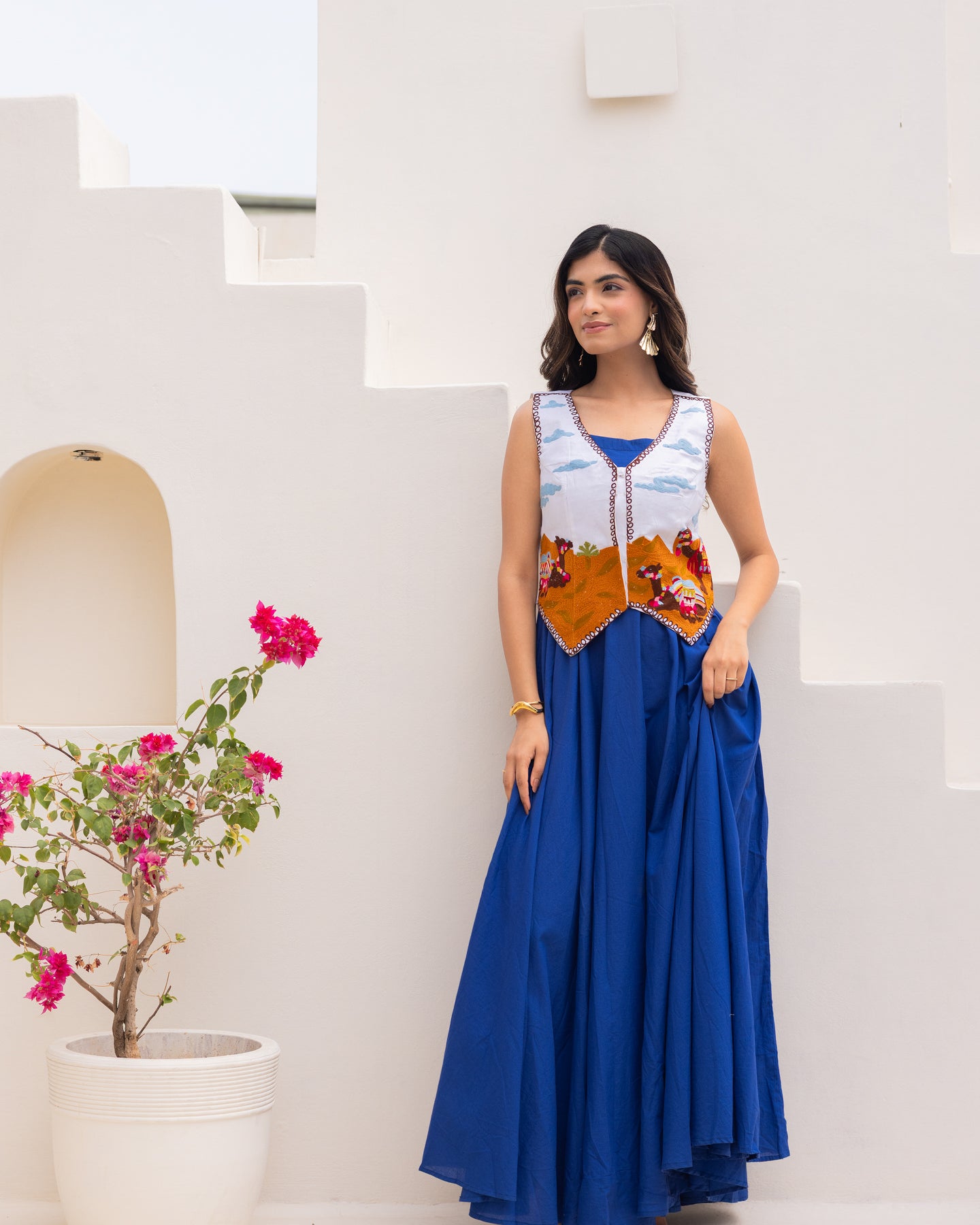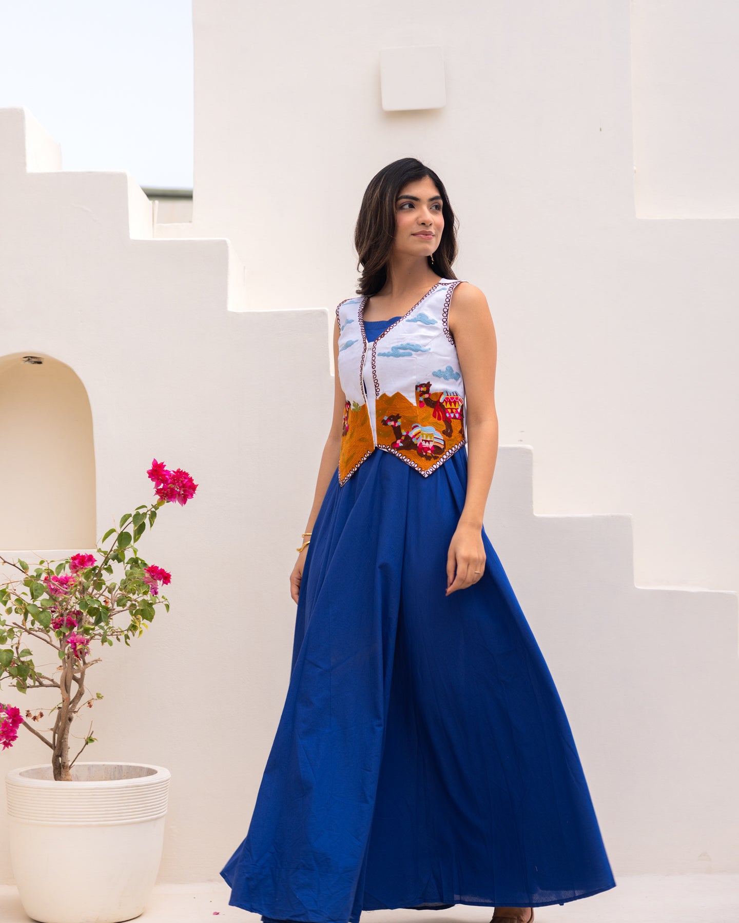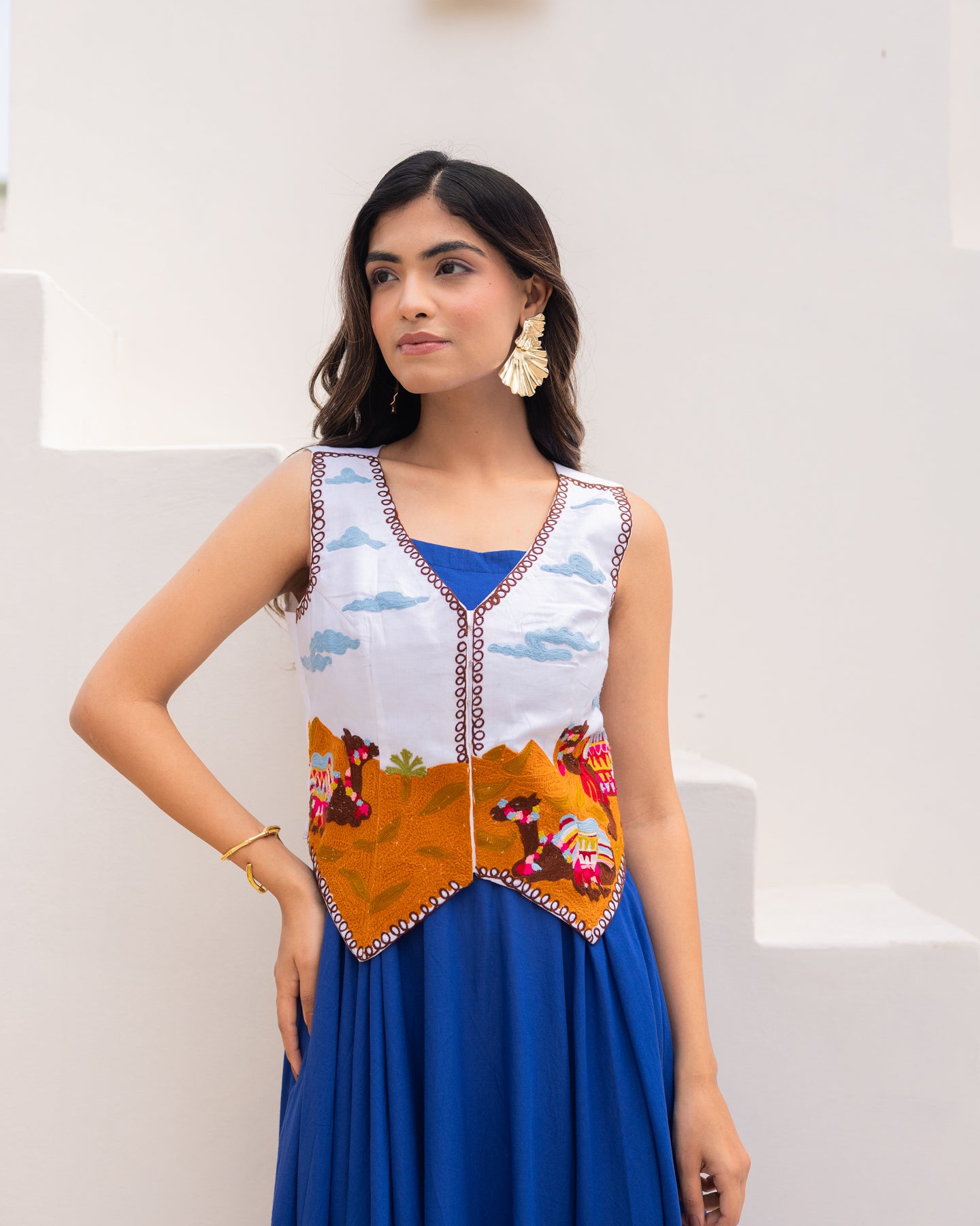 Inspired by the desert landscapes of Rajasthan, this cotton jacket captures the charm of camel caravans and blue skies in colorful embroidery. The bold artwork pops against the white base, making it a standout piece.