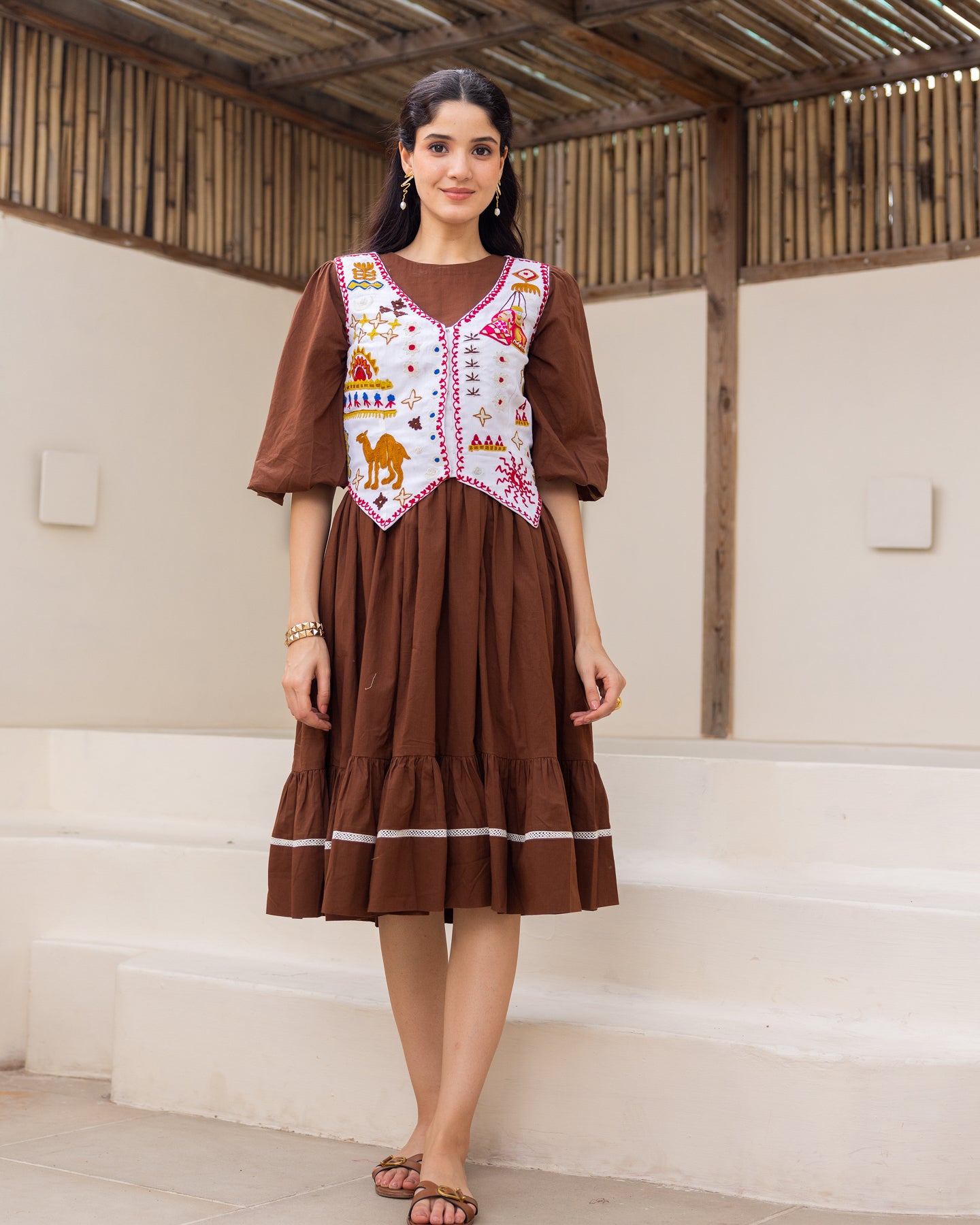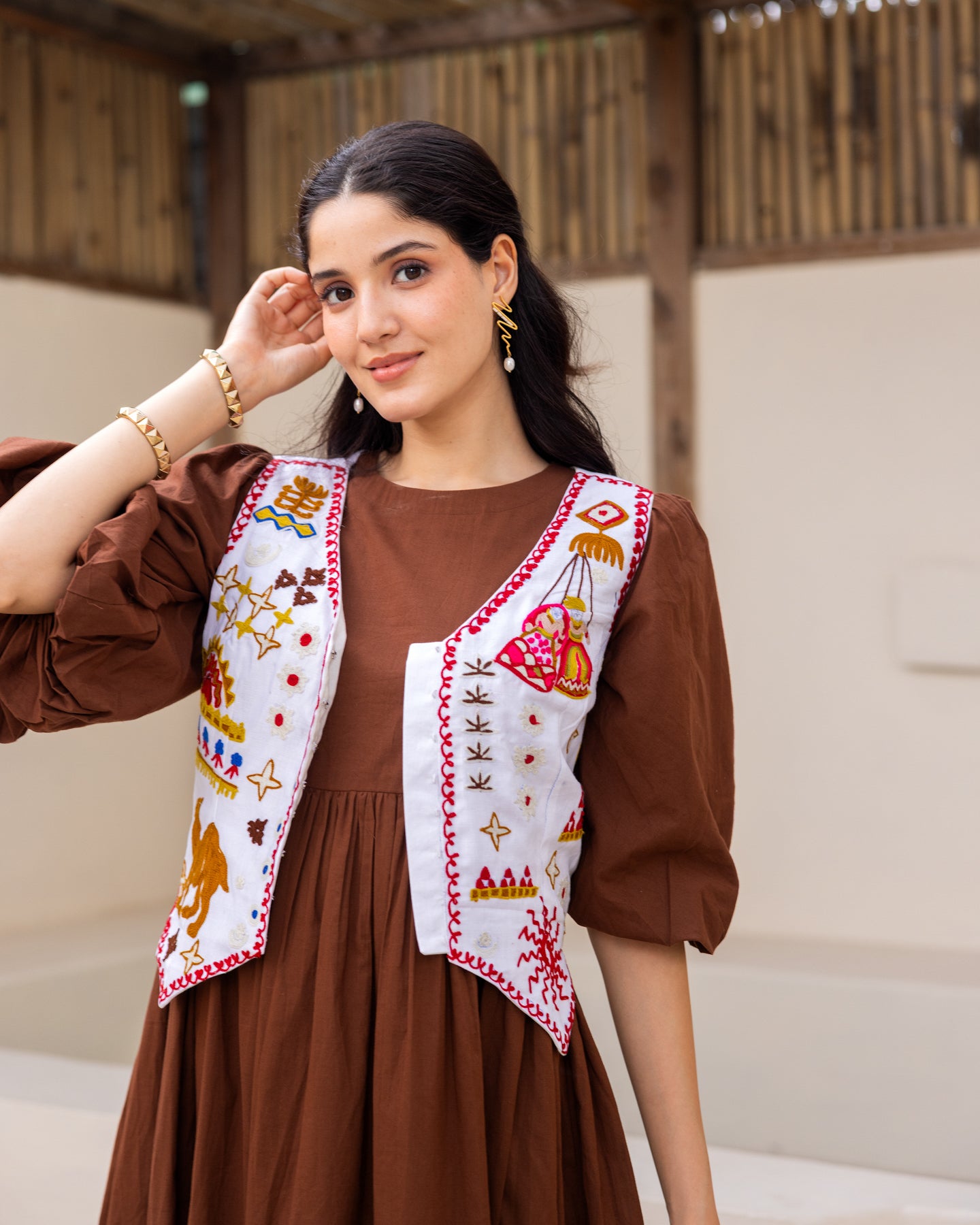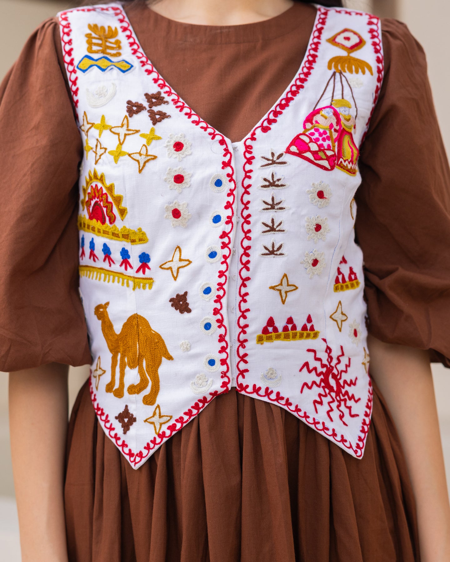 A story of the desert, told in threads. This cotton jacket features hand-embroidered camels, traditional Rajasthani puppets, and vibrant motifs that bring the rich culture of Rajasthan to life.